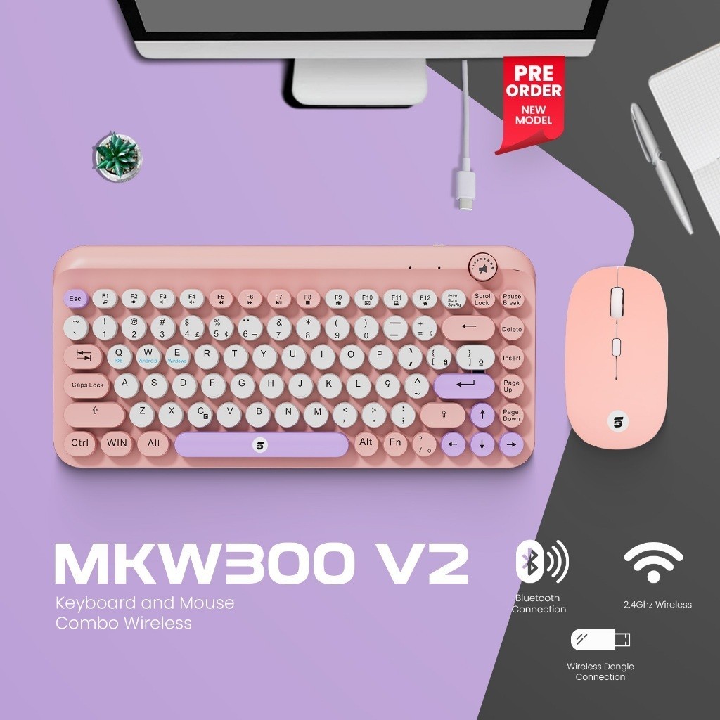 5Star MKW300 V2 New Set Keyboard and Mouse Stylish & Colorful 2Mode Wireless 2.4Ghz And Bluetooth Rechargable For PC Laptop, Hp and Tablet