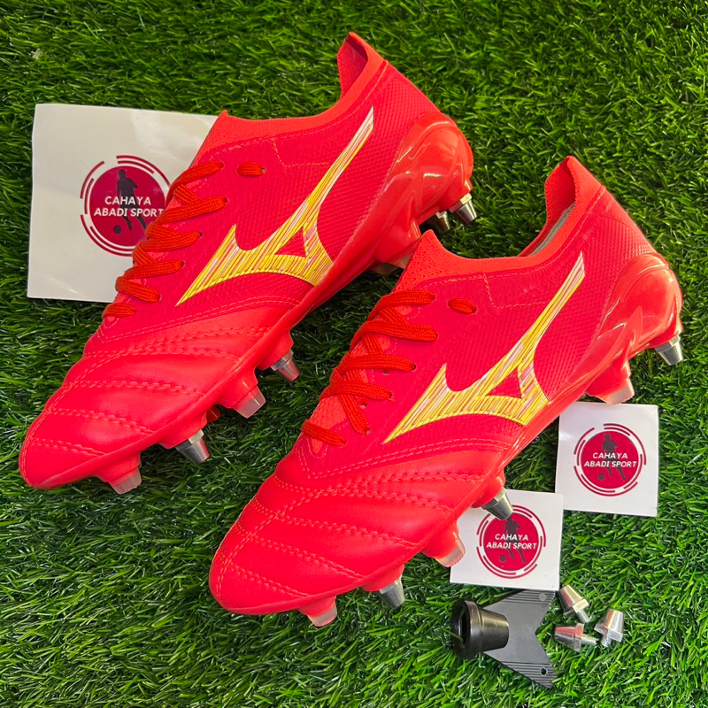( BISA ) SEPATU BOLA MIZUNO MORELIA NEO BETA 4 ANTICLOG FIERY CORAL SG SPUL BESI