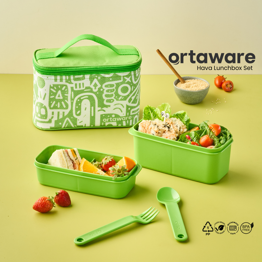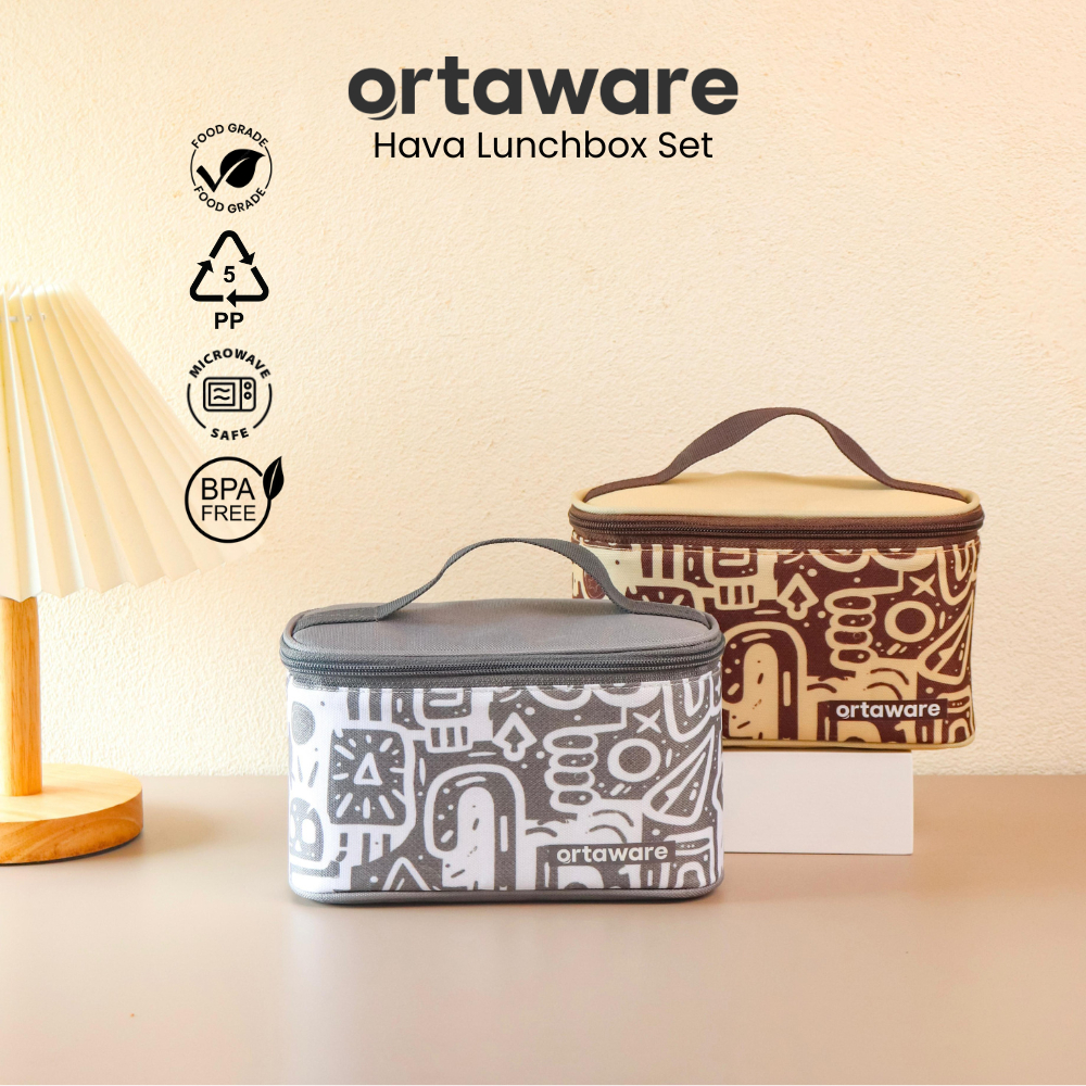 LUNCH BOX KOTAK MAKAN [Hava Lunchbox Set] | ORTAWARE | Tas + Tempat bekal 2 sekat + Sendok Garpu | BPA FREE MICROWAVE SA