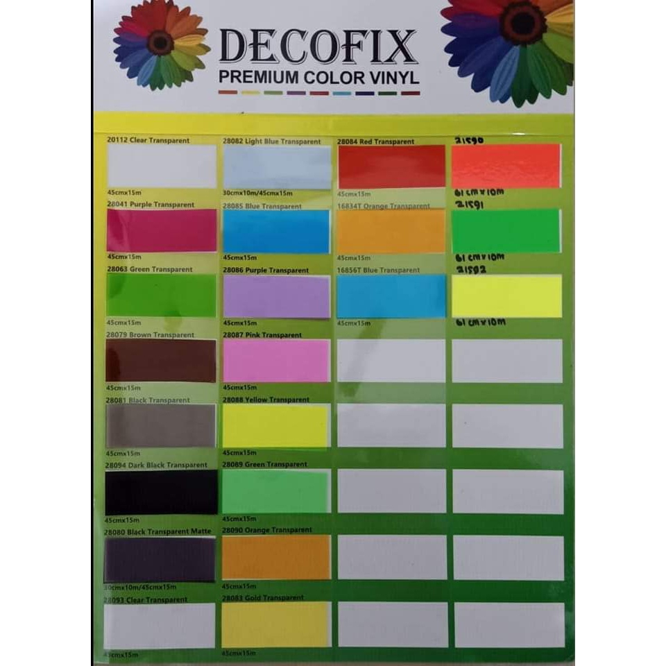 Biru muda, Kuning / gold, Pink, Biru tua, Hijau, Hitam muda, Oranye, Merah, Ungu, Lemon, Hitam Tua, Hitam Matt, Clear, Clear kertas, Clear matt / doff
