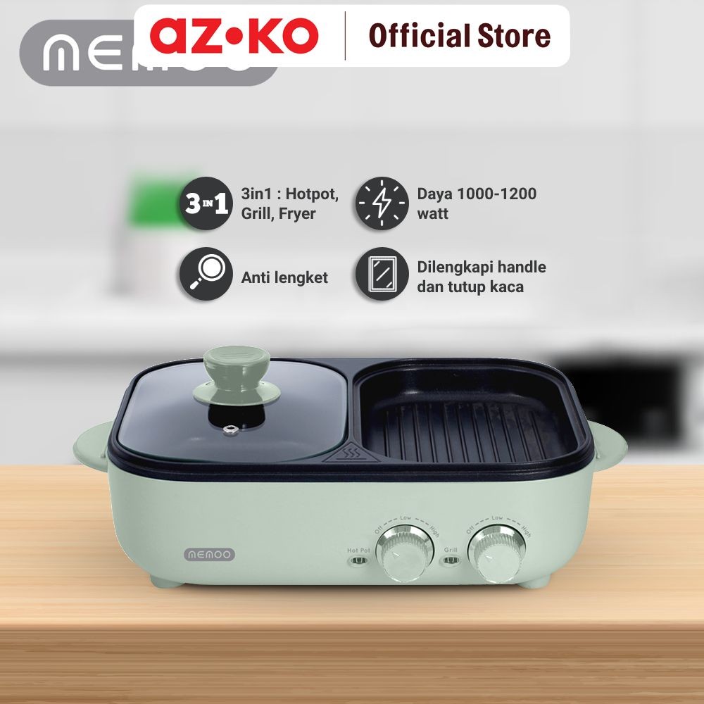 Azko Memoo 1.5 Ltr Multi Cooker 3 In 1 - Hijau Multifunction Hotpot Grill Fryer Peralatan Masak Perlengkapan Dapur Kitch
