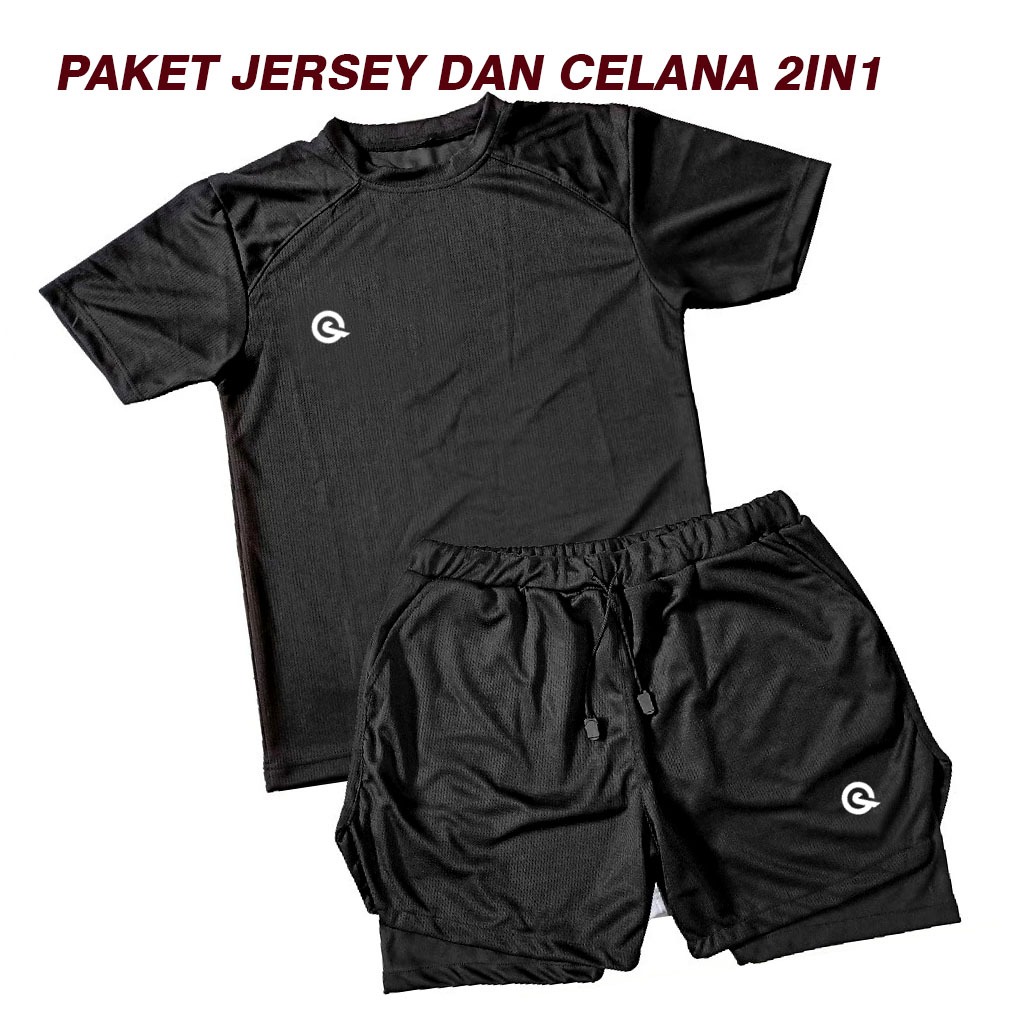 Setelan Olahraga Pria Double Layer 1 Set Baju Jersey Kaos Dryfit Celana Pakaian Outdoor Running gym lari Badminton Volly