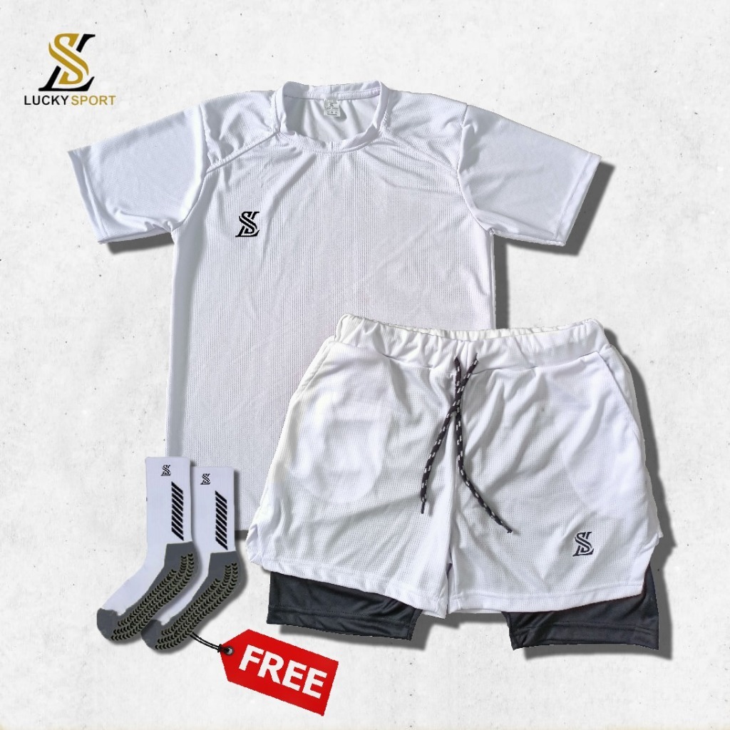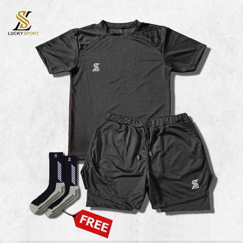 Setelan Olahraga Pria Dryfit Baju Kaos + Celana Outdoor Running Gym Lari Badminton Futsal 1 Set Free Kaos Kaki