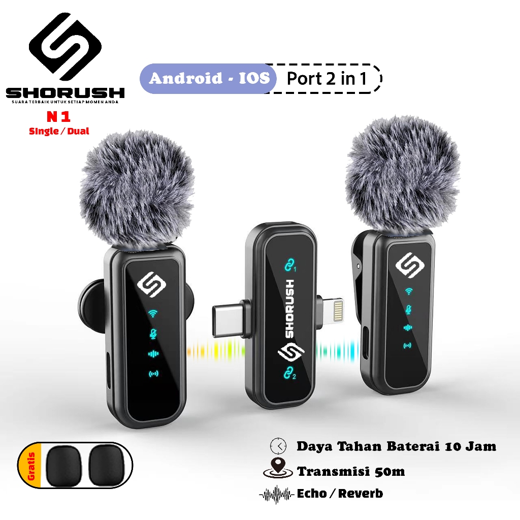 Shorush N1 2 In 1 Single Dual Wireless Microphone Clip On Mic Portable Microphone Mikrofon Lavalier HP Untuk Live Stream