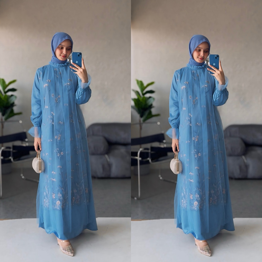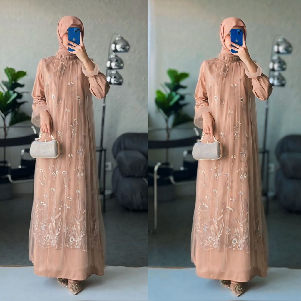 PROMO Sheren ( DRESS + KOREAN TULLE ) DRESS TERBARU / GAMIS KONDANGAN / DRESS PESTA TILE PREMIUM / GAMIS PE
