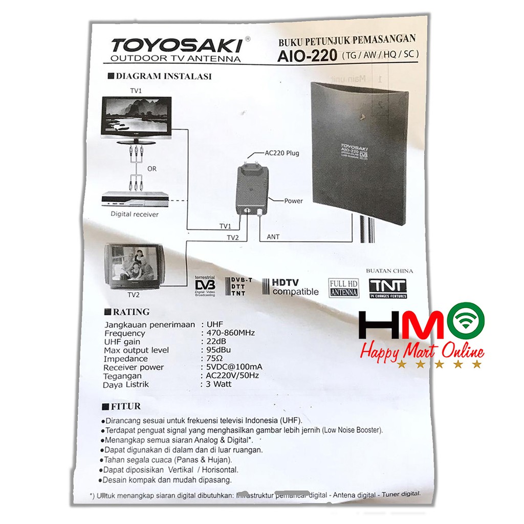 Antena TV Digital Indoor & Outdoor Toyosaki AIO 220 / AIO-220 + Kabel 10 Meter