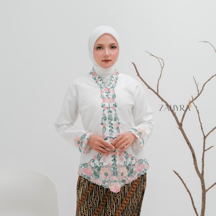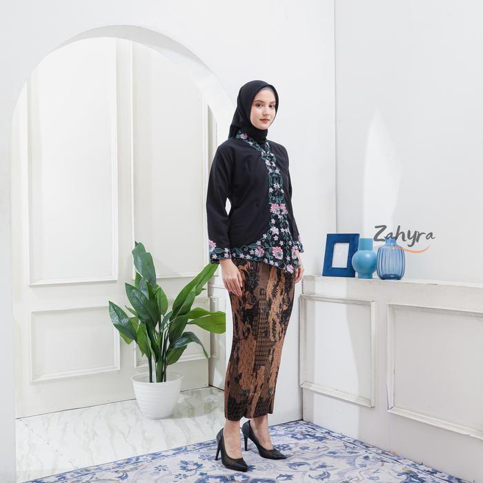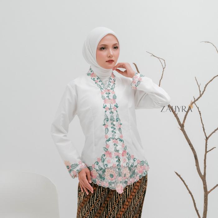 ZAHYRA KEBAYA ENCIM BORDIR MOTIF BUNGA MELATI LENGAN PANJANG KATUN POLYMIKRO SERAGAM WANITA UNTUK WISUDA DAN SEKOLAH DRESS BAJU ATASAN PUTIH - HITAM, S