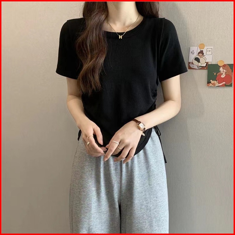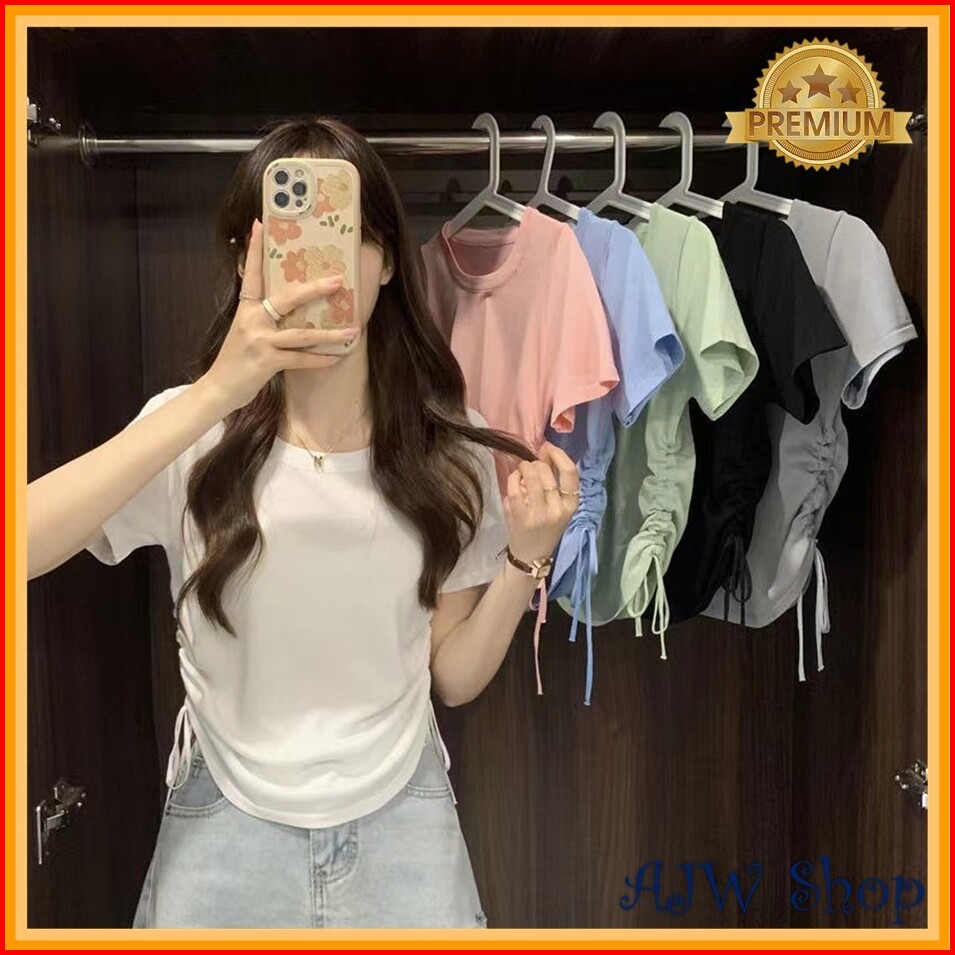 Ajw Crop Top Rajut Serut Samping Lengan Pendek Haw Atasan Crop Top Korea Serut Samping Kekinian Baju Wanita Knit Tali Se