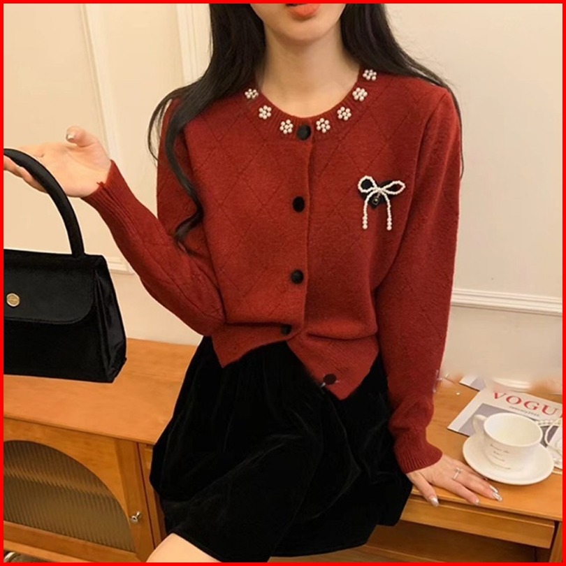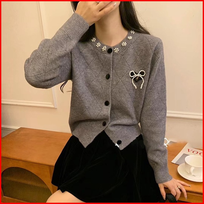 Ajw Cardigan Pita Ribbon Variasi Mutiara Knit Premium Kekinian Wdk Kardigan Rajut Variasi Pita Mutiara Korean Style Atas