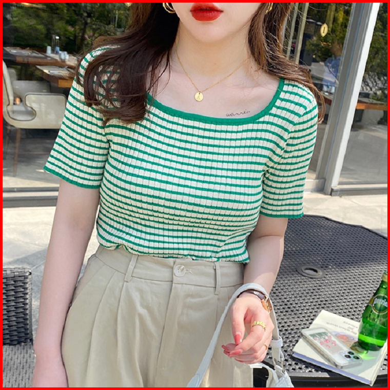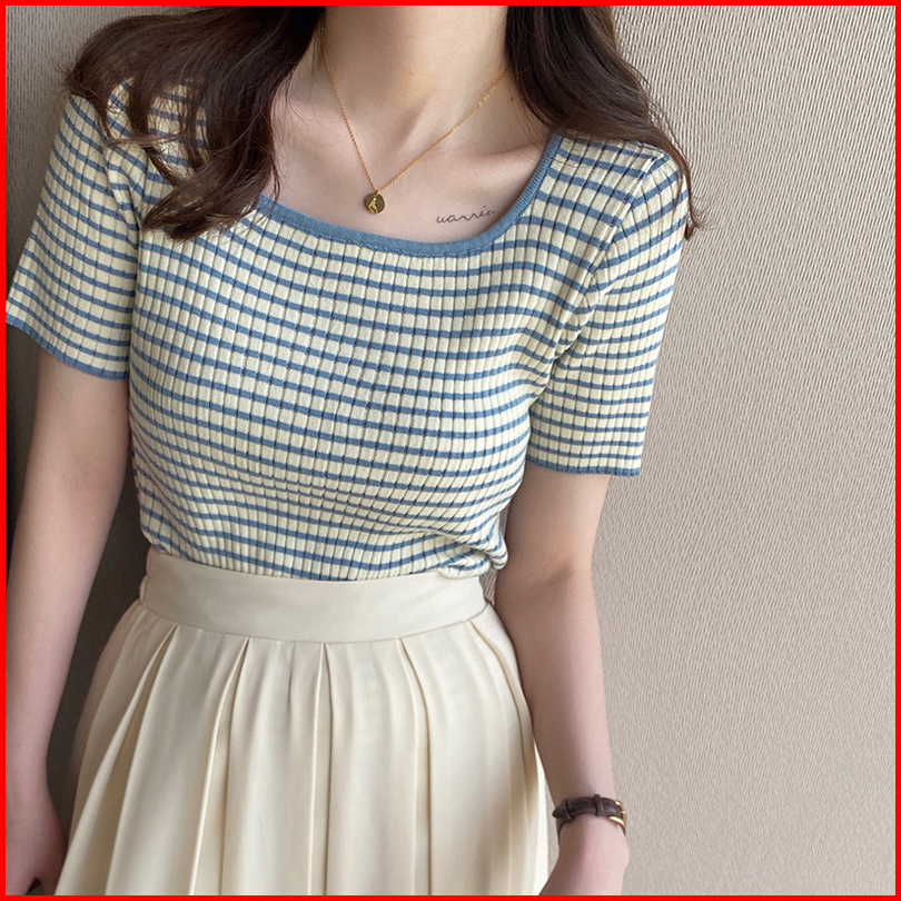 Ajw Rajut Stripe Wanita Lengan Pendek Salur Garis Garis Hac Kaos Pendek Wanita Kaos Rajut Kaos Rajut Wanita Import Lenga
