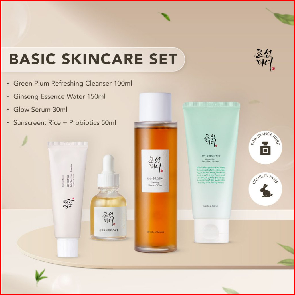 Beauty Of Joseon Basic Skincare Set Green Plum Refreshing Cleanser Ginseng Essence Water Glow Serum Sunscreen