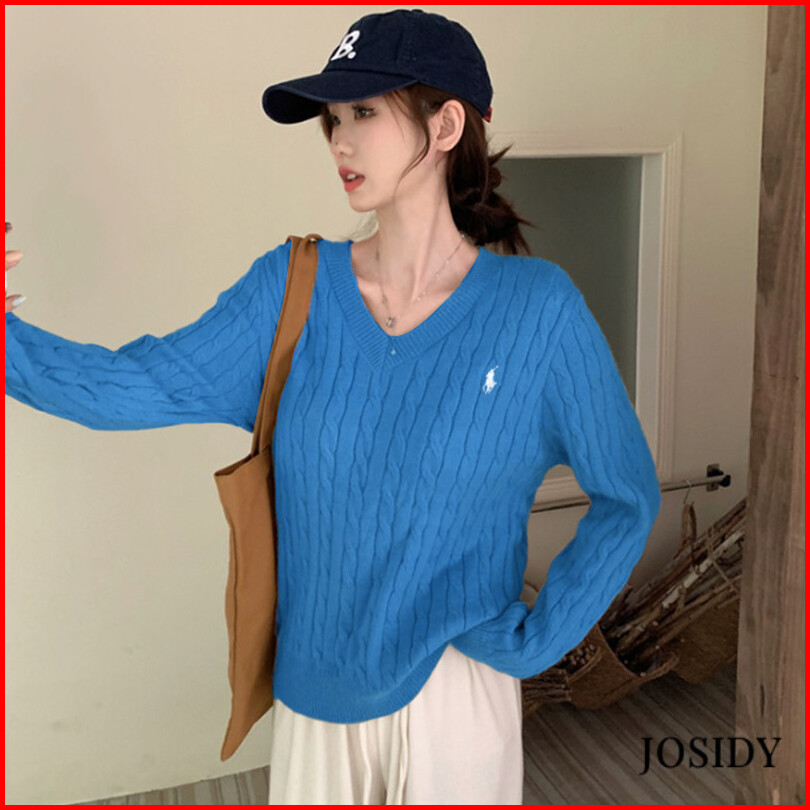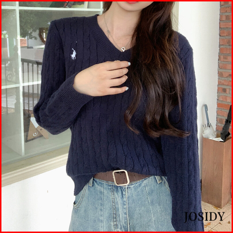Twisted Kerah V Pakaian Rajut Pullover Lengan Panjang Vintage Bordir Pakaian Rajut Wanita Sweater Jd