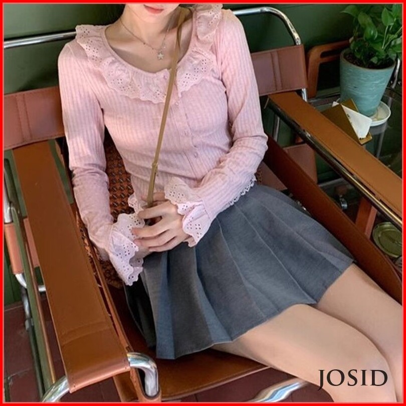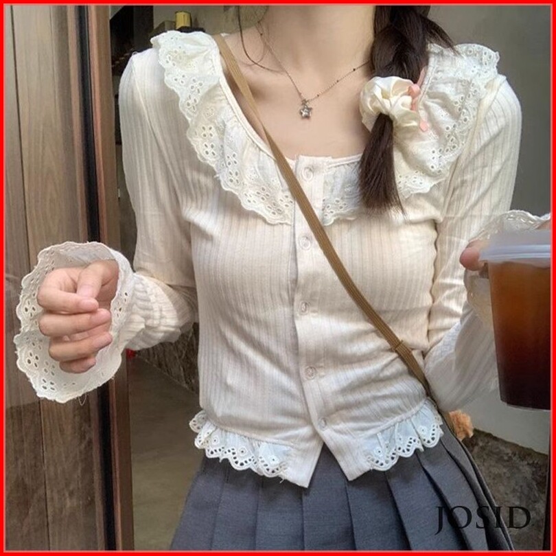 Pakaian Rajut Kerah Renda Retro Kemeja Bawah Serbaguna Pas Badan Pakaian Rajut Lengan Panjang Wanita Jd