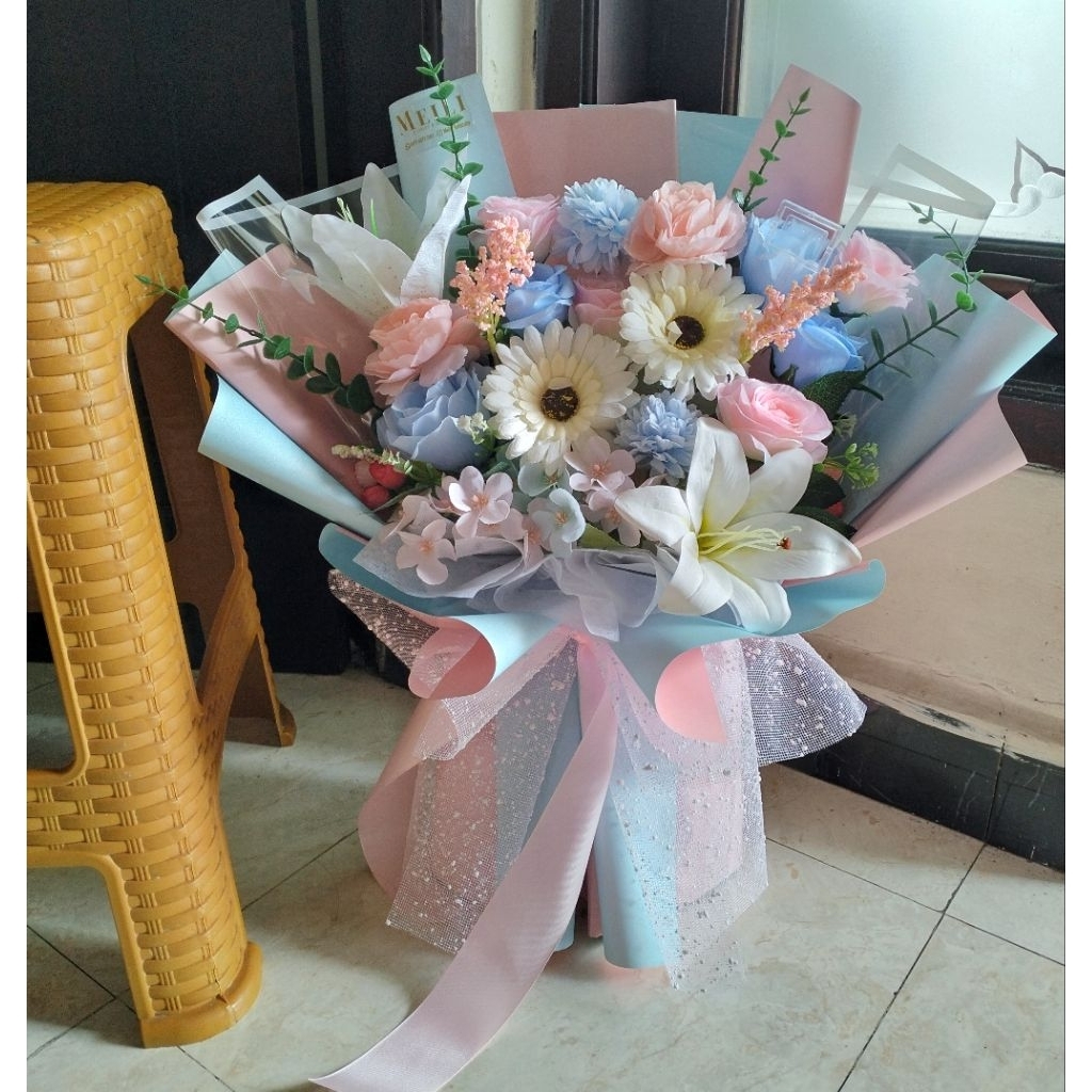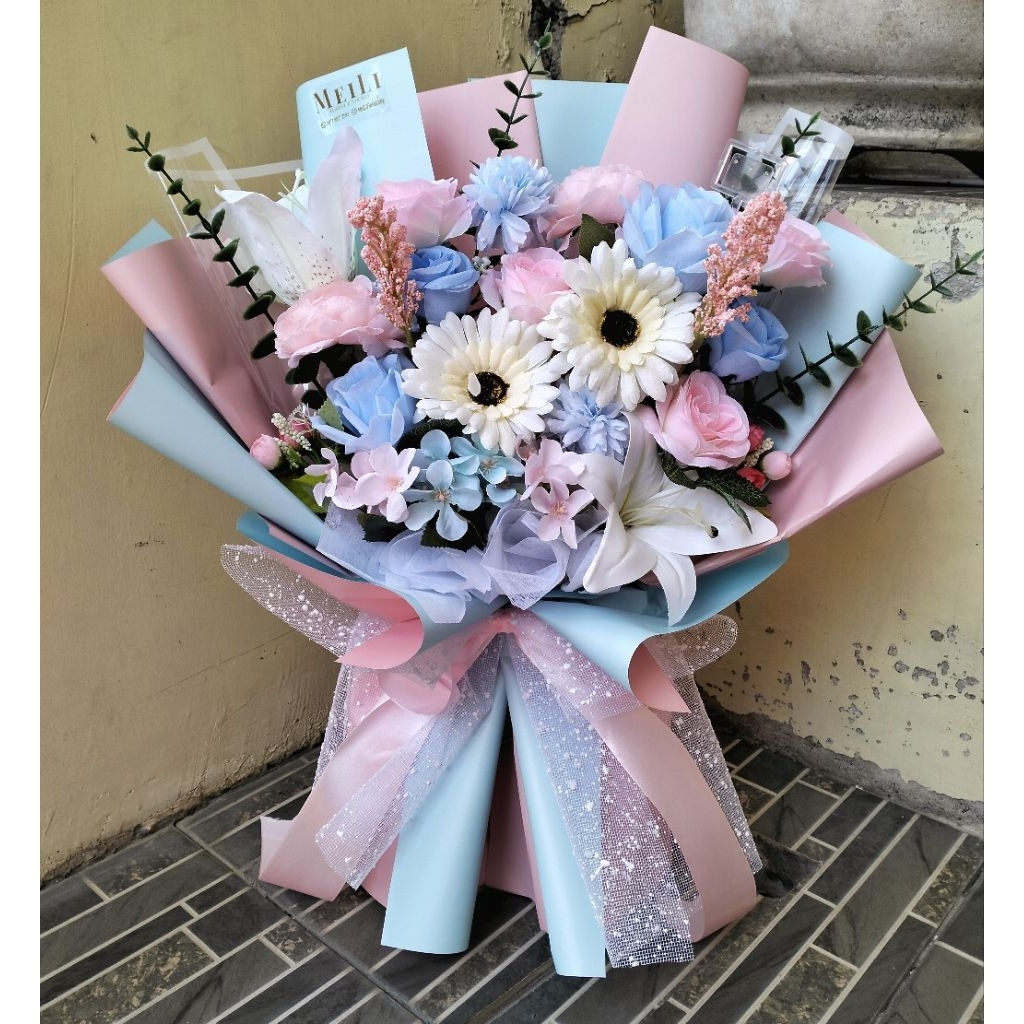Buket Bunga Artificial XL Baby Pink Blue 55x40 Cm