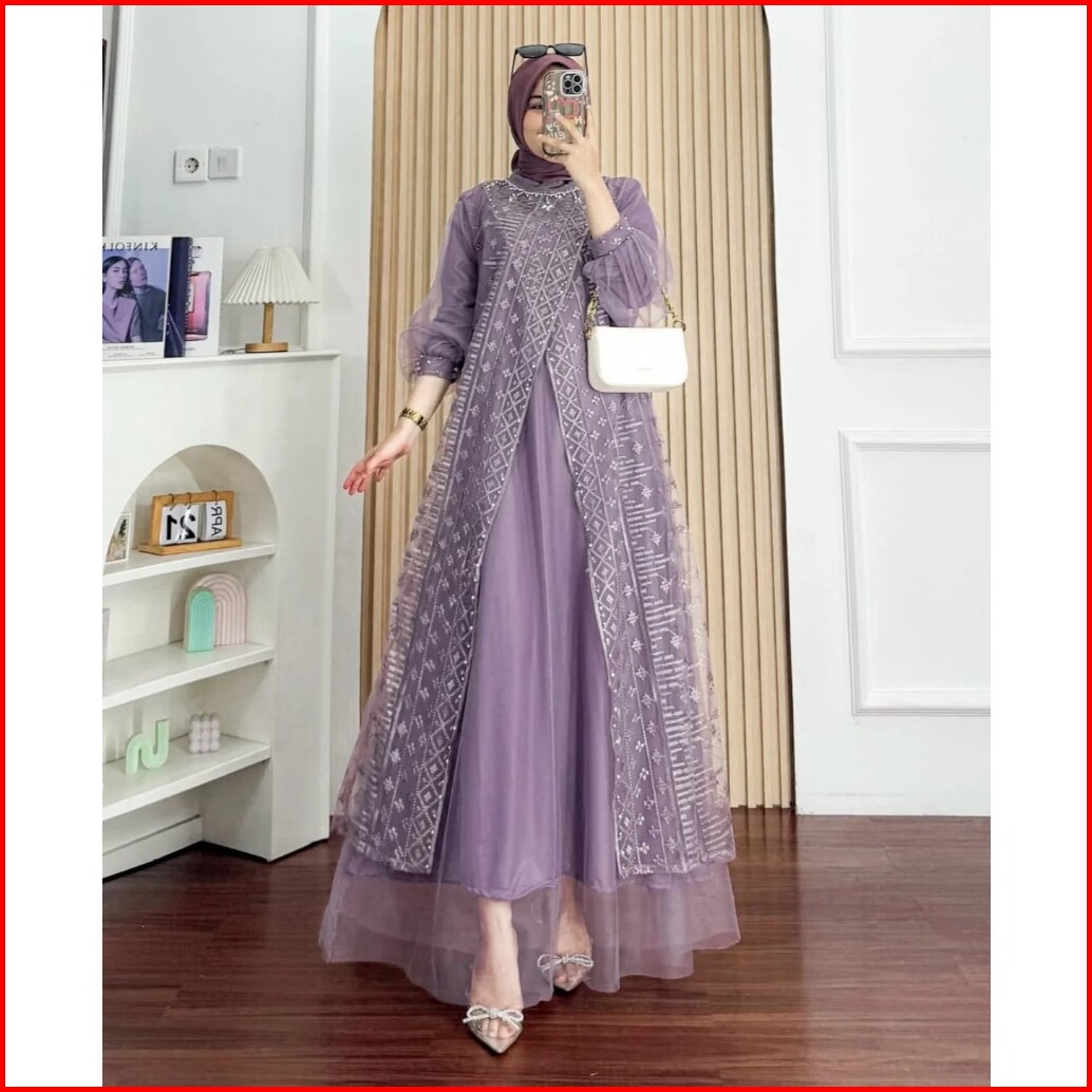 Keyla Dress Gamis Mewah Bahan Tille Mix Brukat Full Puring Payet Mutiara Gamis Pesta Mewah Simpel
