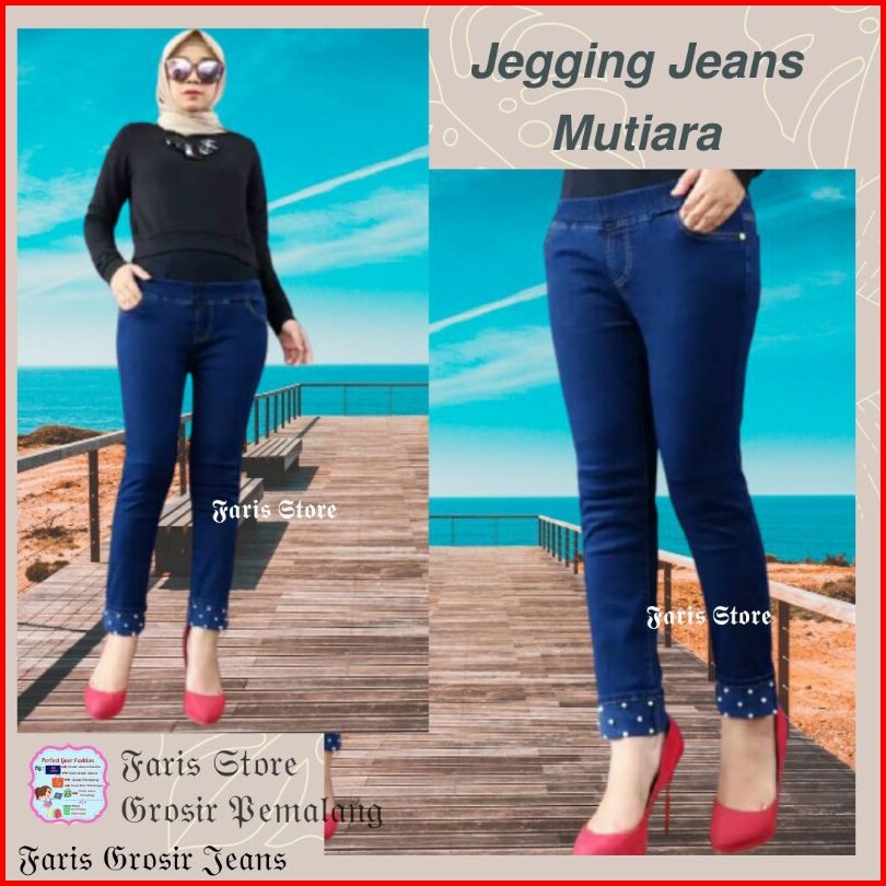 Celana Jeans Jegging Leging Jeging Legging Mutiara Lipat Bawah Wanita Cewek Pinggang Karet Murah