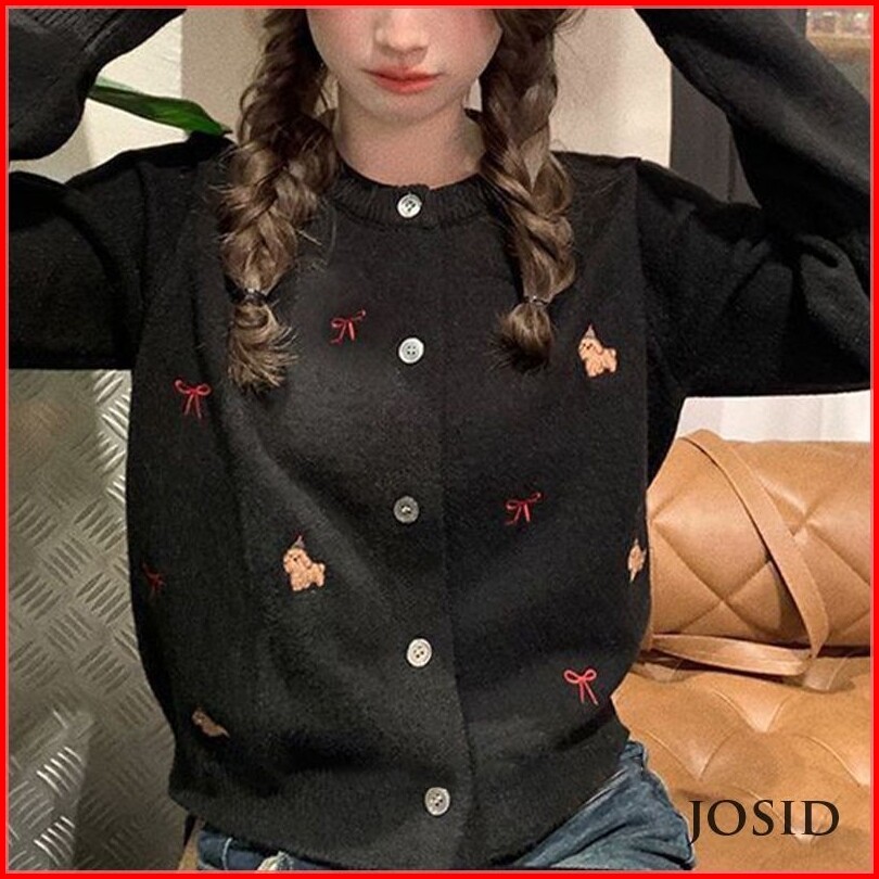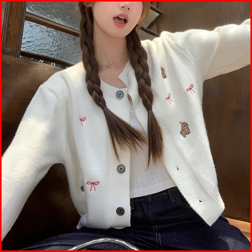 Kardigan Rajut Bordir Anak Anjing Pita Atasan Pendek Lembut Modis Jaket Serbaguna Rasa Desain Wanita Jd