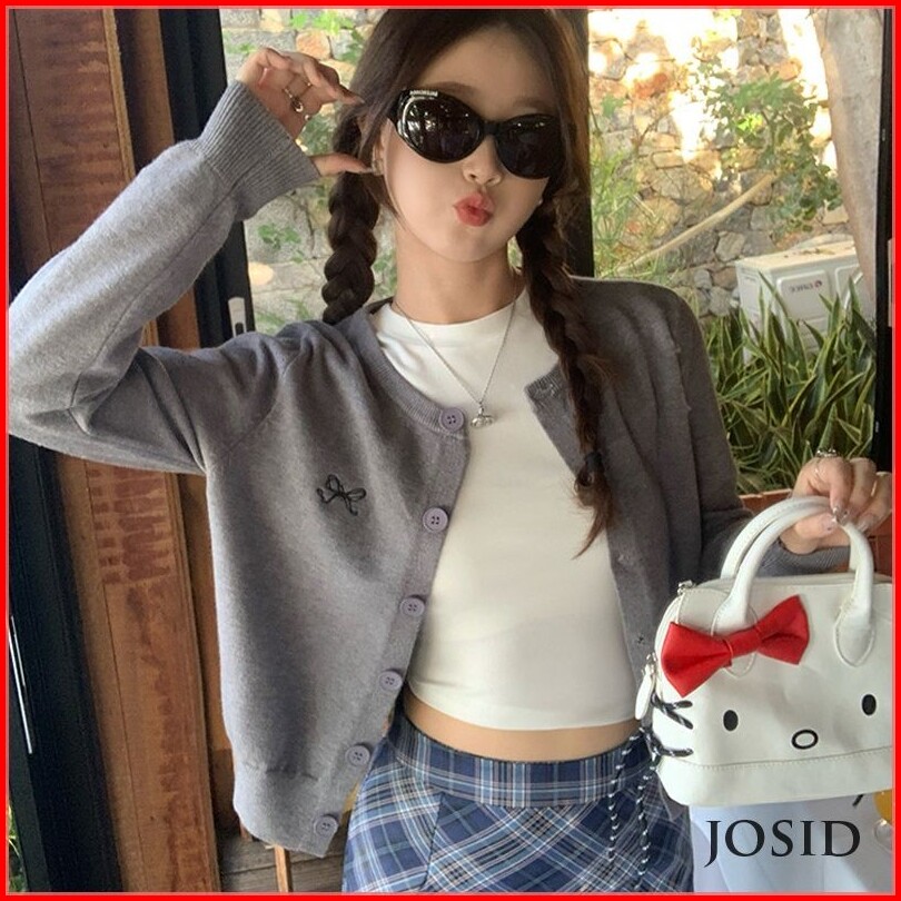 Kardigan Tipis Bordir Pita Pakaian Rajut Pendek Wanita Jaket Lengan Panjang Kancing Sebaris Jd
