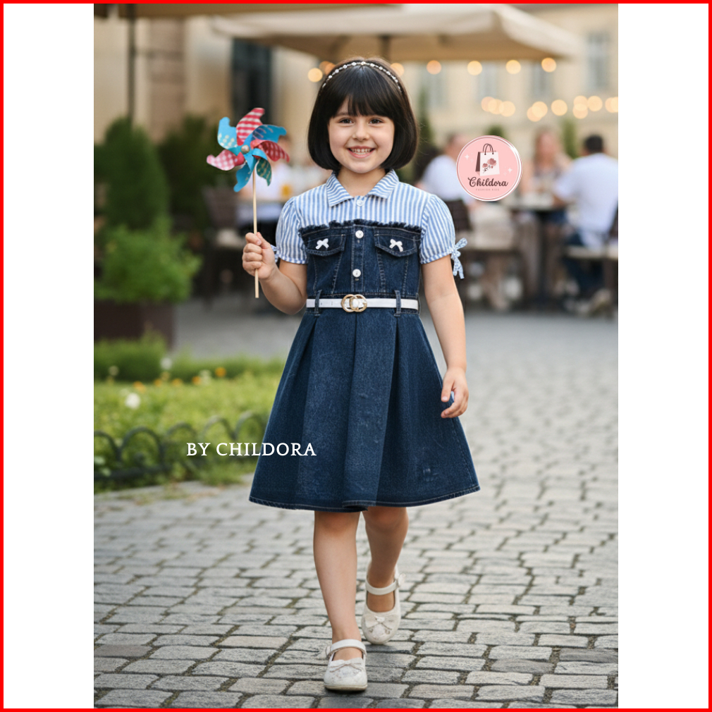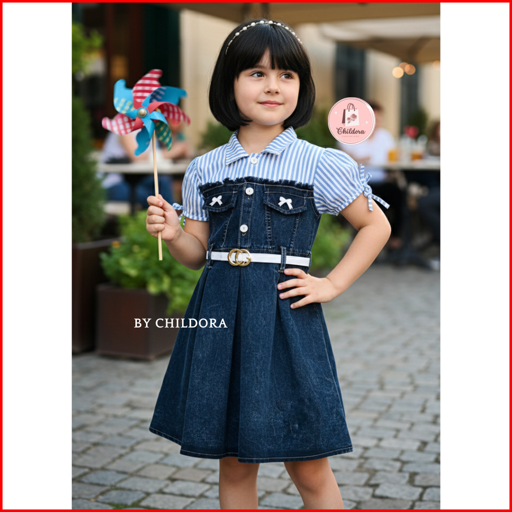 Aurel Dress Jeans Motif Salur Anak Perempuan Usia 3-8 Tahun Free Belt Dress Jeans Terbaru Anak Kekinian Midi Dress Lenga