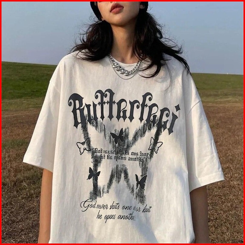 Pink Butterfly Print T-shirt For Men And Women Harajuku Hip-hop Short Sleeve Pure Cotton White Tops Casual Oversi