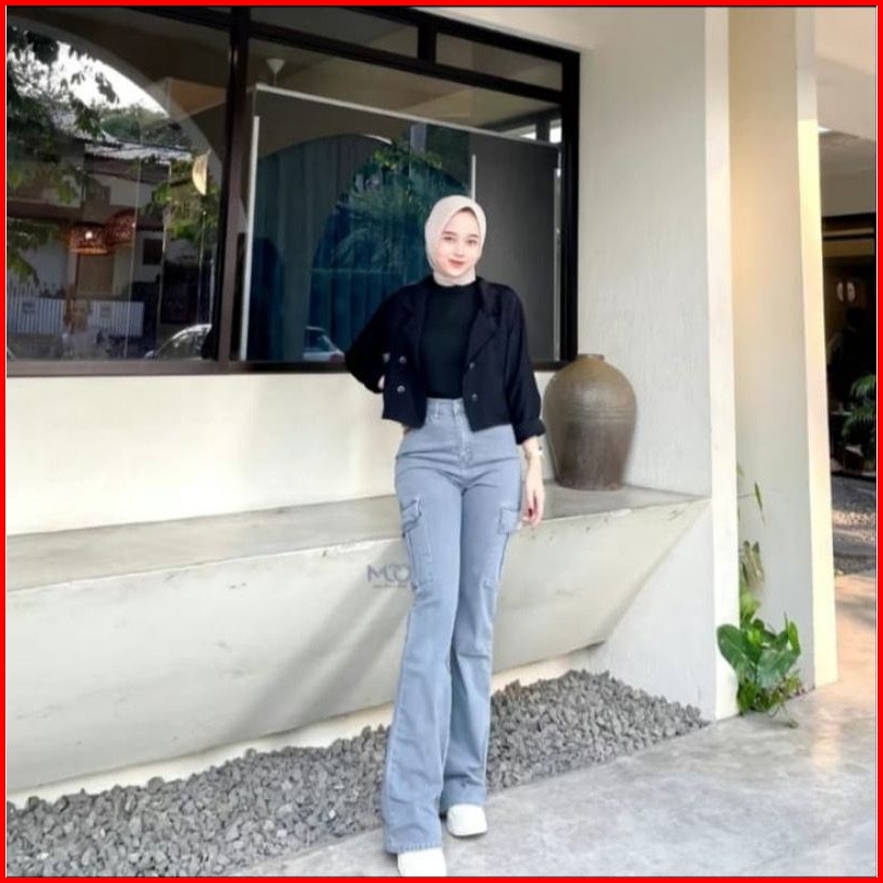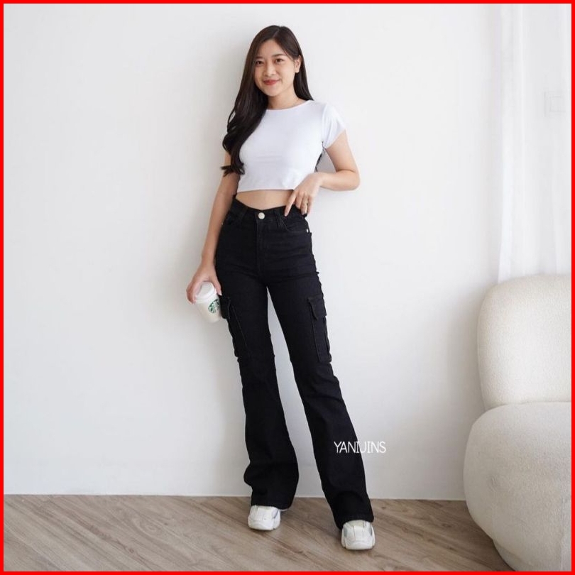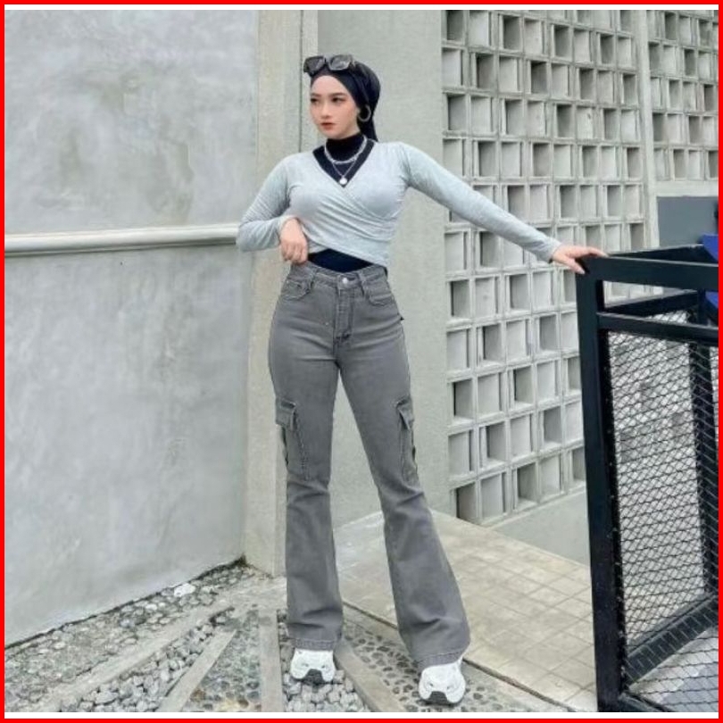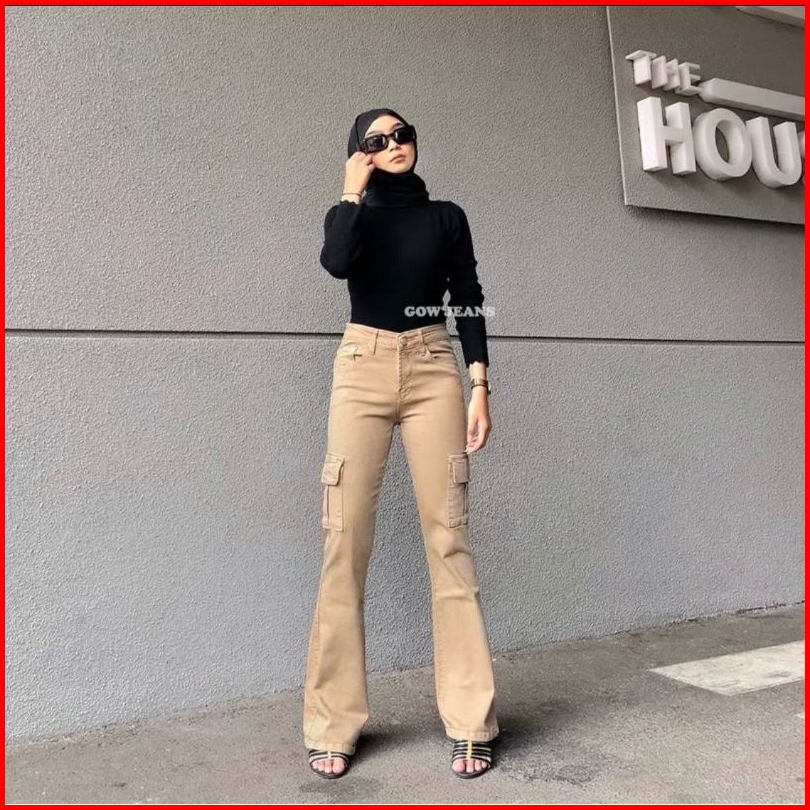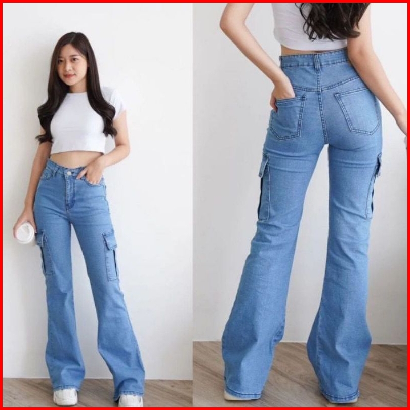 Cargo Jeans Cutbray Stretch Melar Highwaist Panjang Celana Jeans Highwaist Cutbray Cargo
