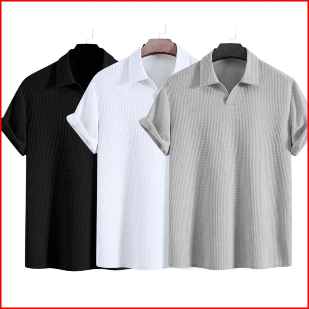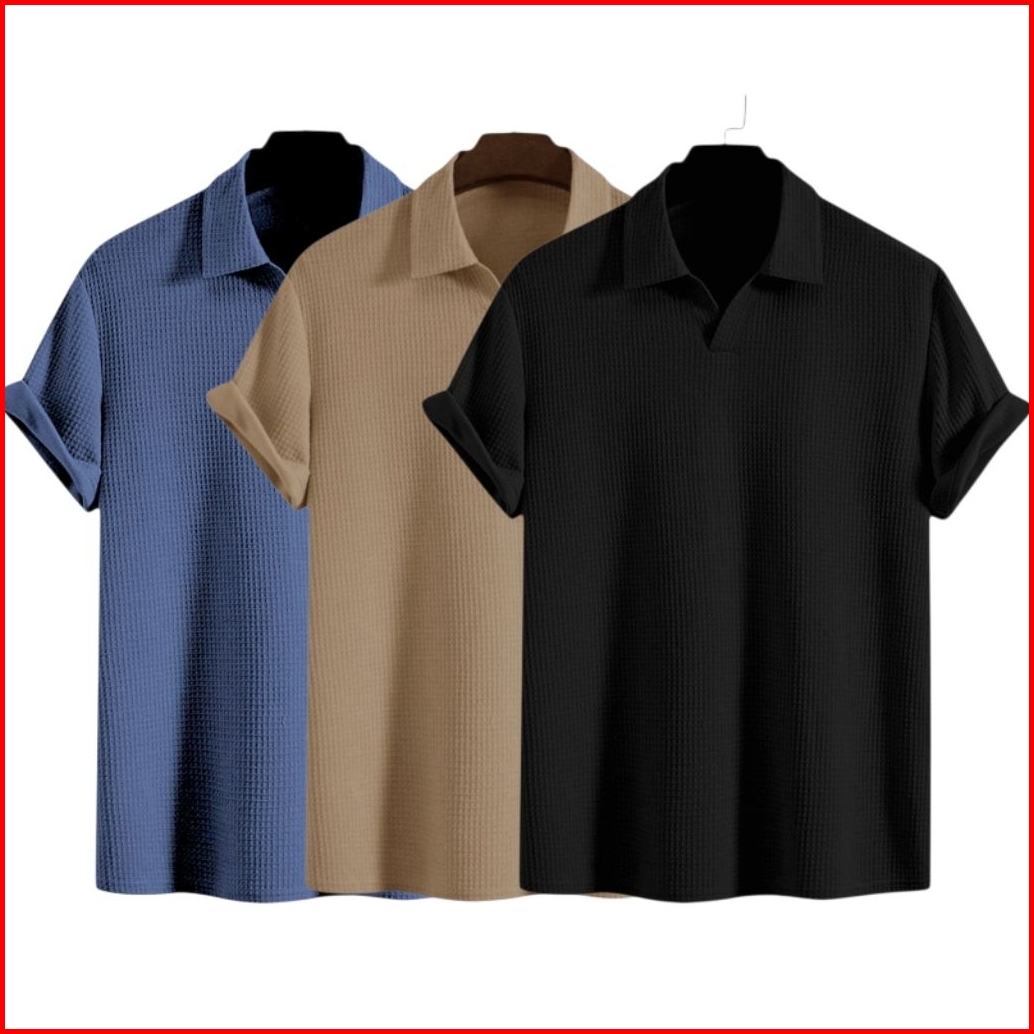 Paket 3 Pcs Kaos Kerah Polo V-neck Lengan Pendek Bahan Waffle Premium Baju Keren Dewasa Atasan Cowok
