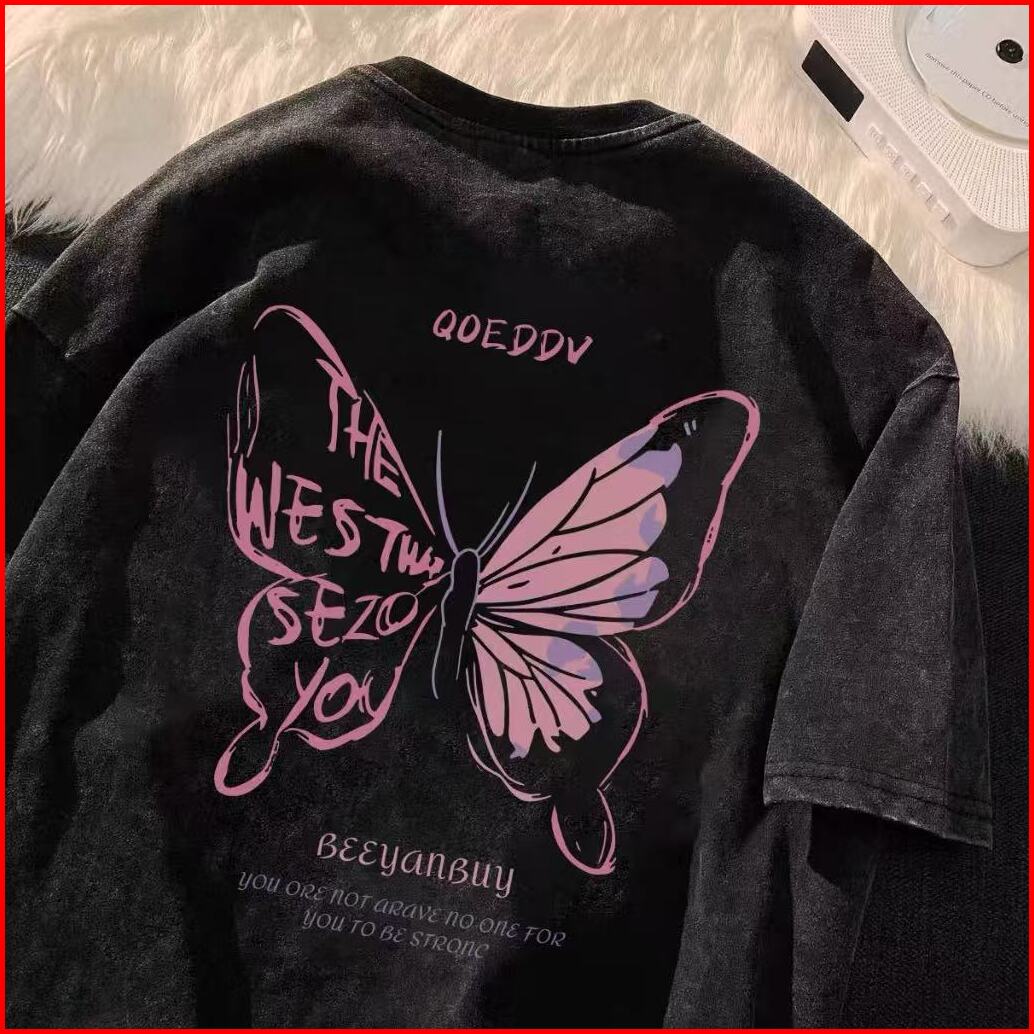 Lucky88k Kaos Oversize Lengan Pendek Black Washed Motif Pink Butterfly Retro Vintage Korean Style 100 Cotton Atasan Wani