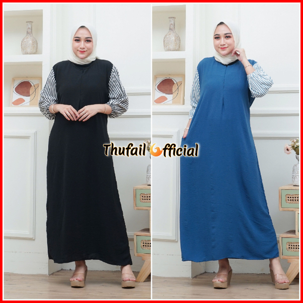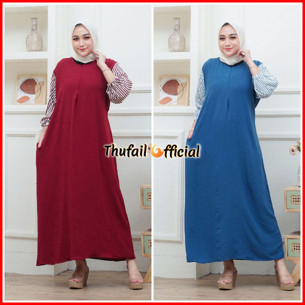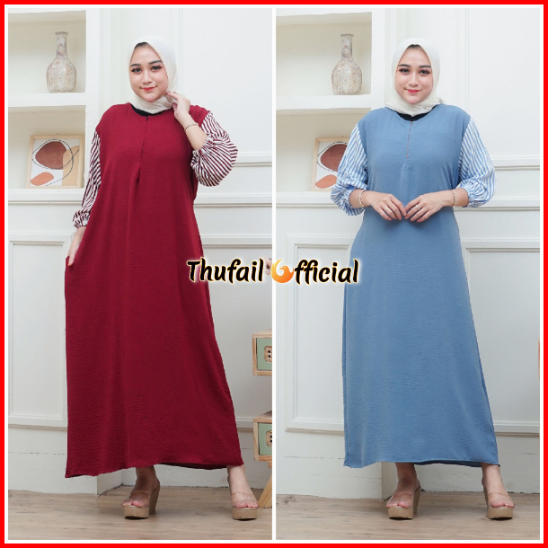 Paket 2 Pcs Lisha Dress Gamis Crinkle Kombinasi Salur Rayon Premium Busui Lengan 7 8 Kerut