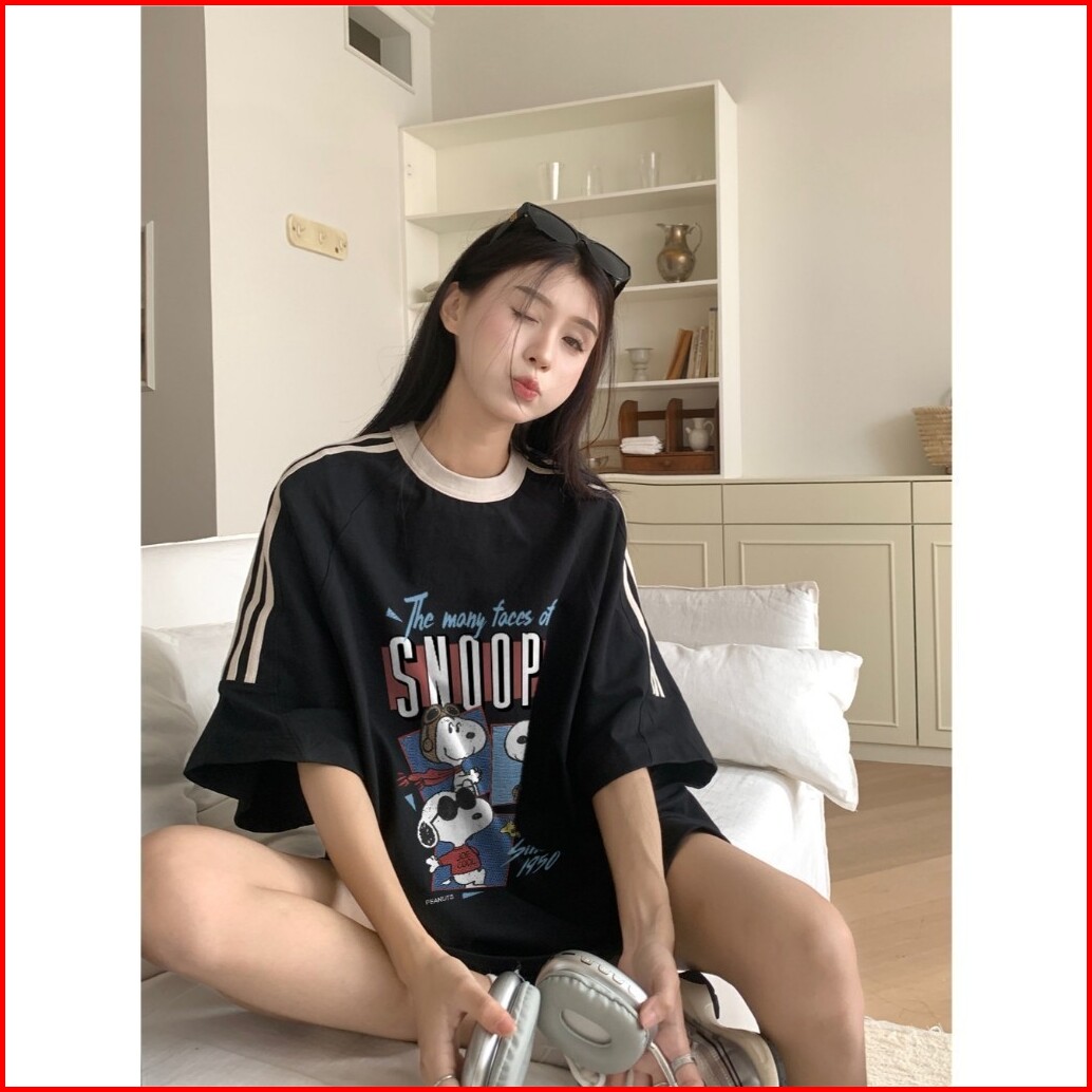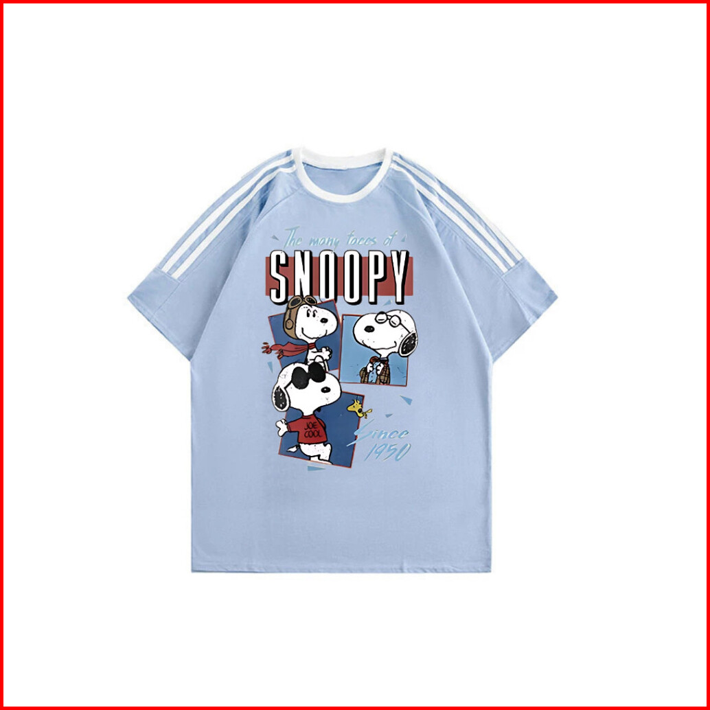 Kaos Lengan Pendek Garis Tiga T-shirt Oversize Pola Snoopy Korean Style Kaos Longgar 100 Cotton