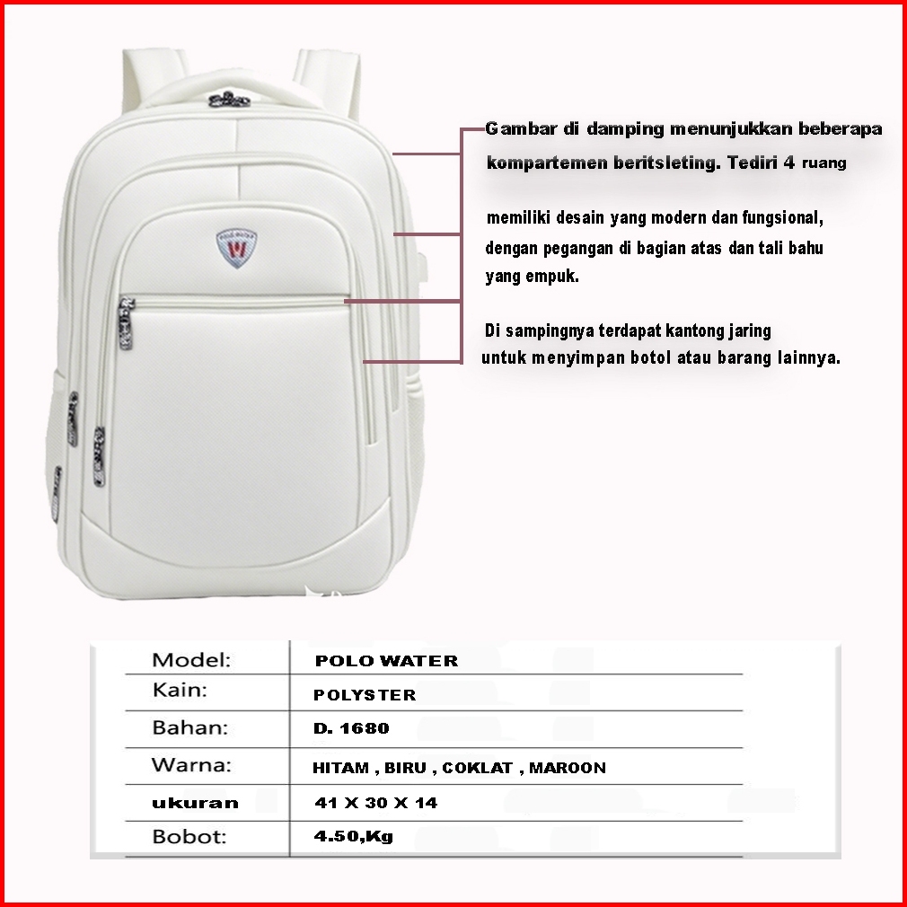 Tas Ransel Polo Water Resistant Sekolah Kerja Backpack Pria Wanita Ukuran Besar Laptop 14 Inch