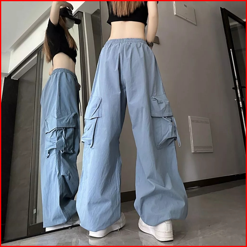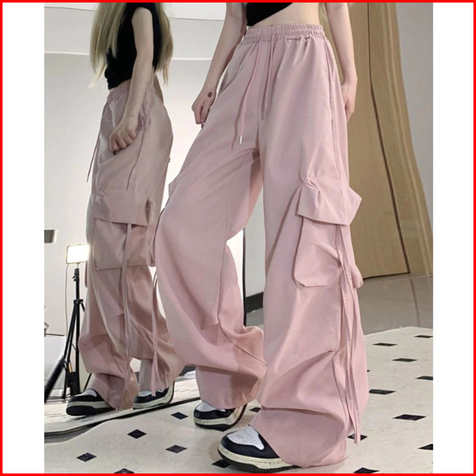 Yuruma Oversize S-5xl Celana Kargo Jalanan Untuk Wanita Celana Panjang Pinggang Tinggi Kaki Lebar Dengan Saku