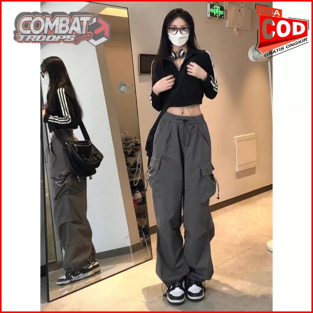 Celana Kasual Harajuku Kargo Teachwear Stretwear Pria Wanita Pants Wanita Premium Highwaist Polos Casual Serut Oversize