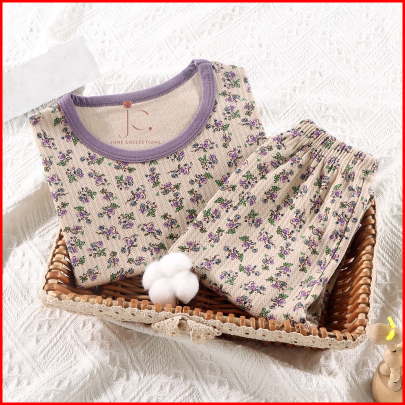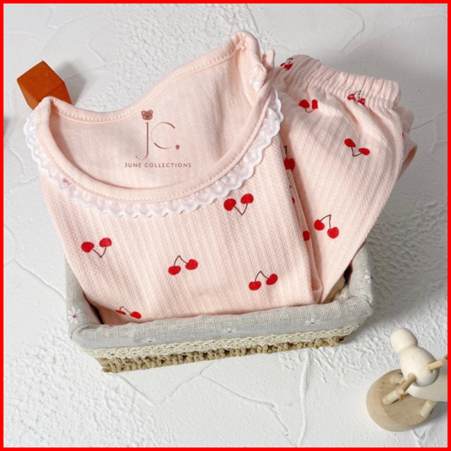 Baju Tidur Anak Setelan Piyama Bayi Set Lengan Panjang Bahan Lembut Piyama Motif Daun Pita Cherry