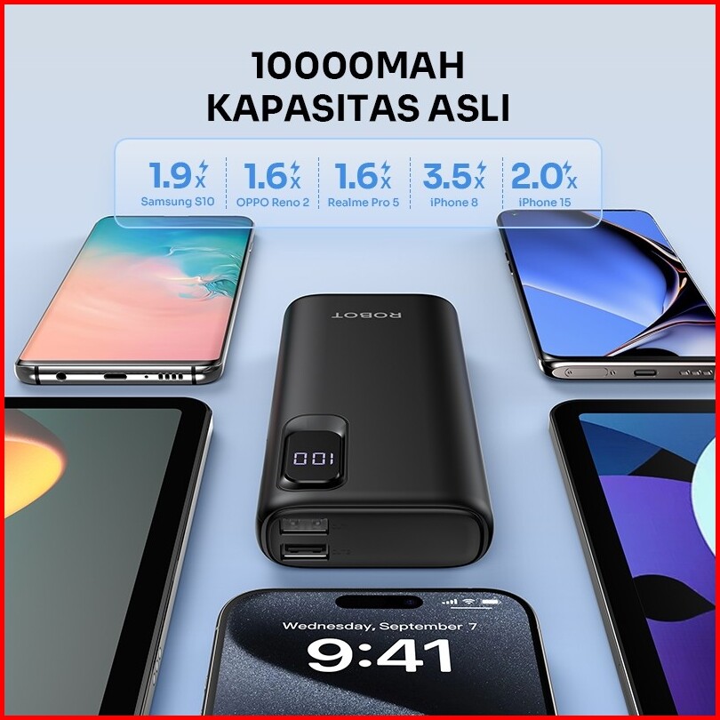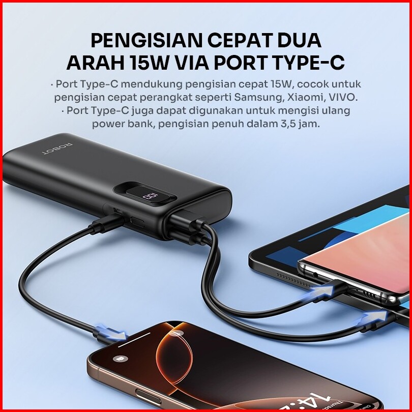 Robot Power Bank 10000mah Fast Charging 15w Led Display Tipe 2 Input 3 Output Power Bank Rt102 - Garansi 1 Tahun