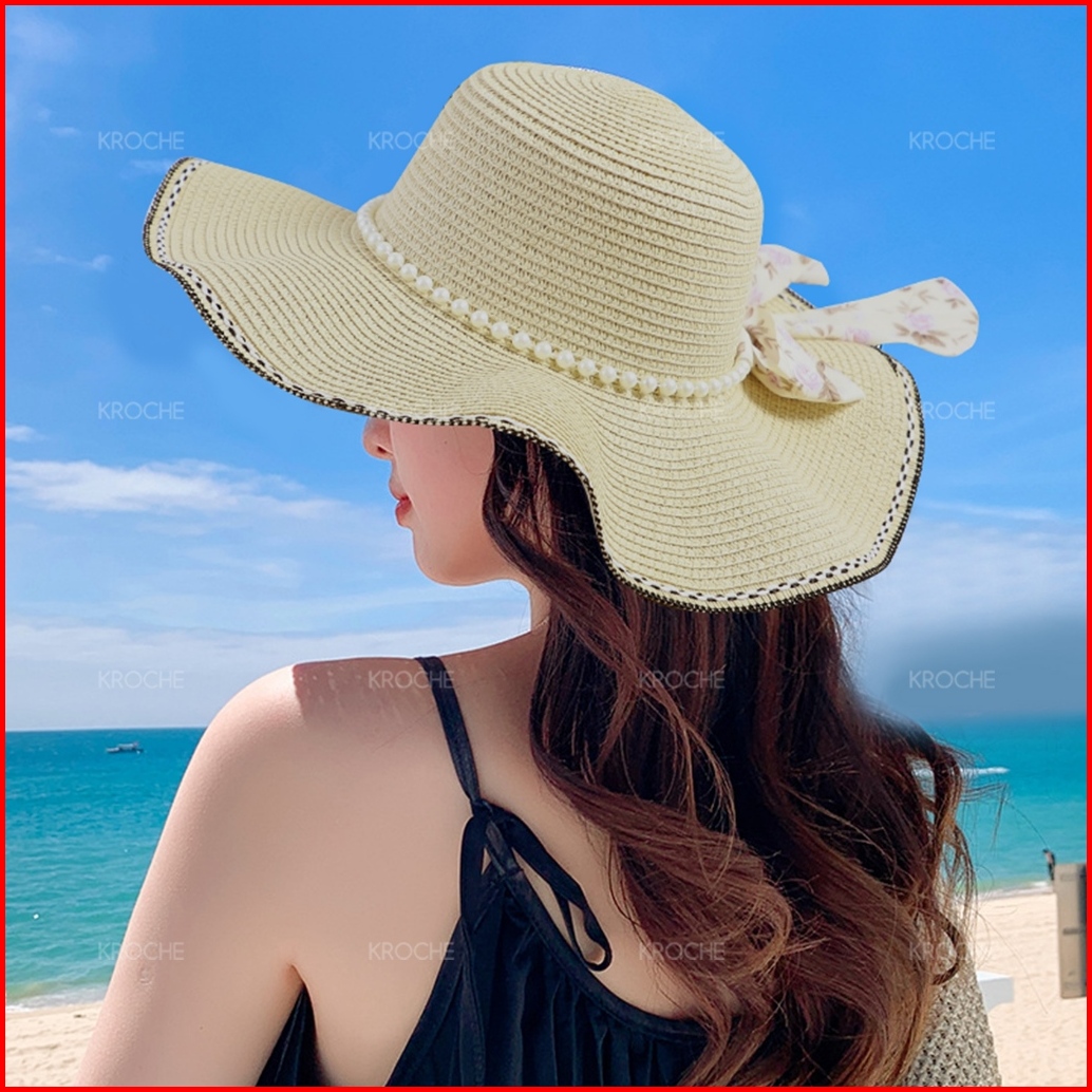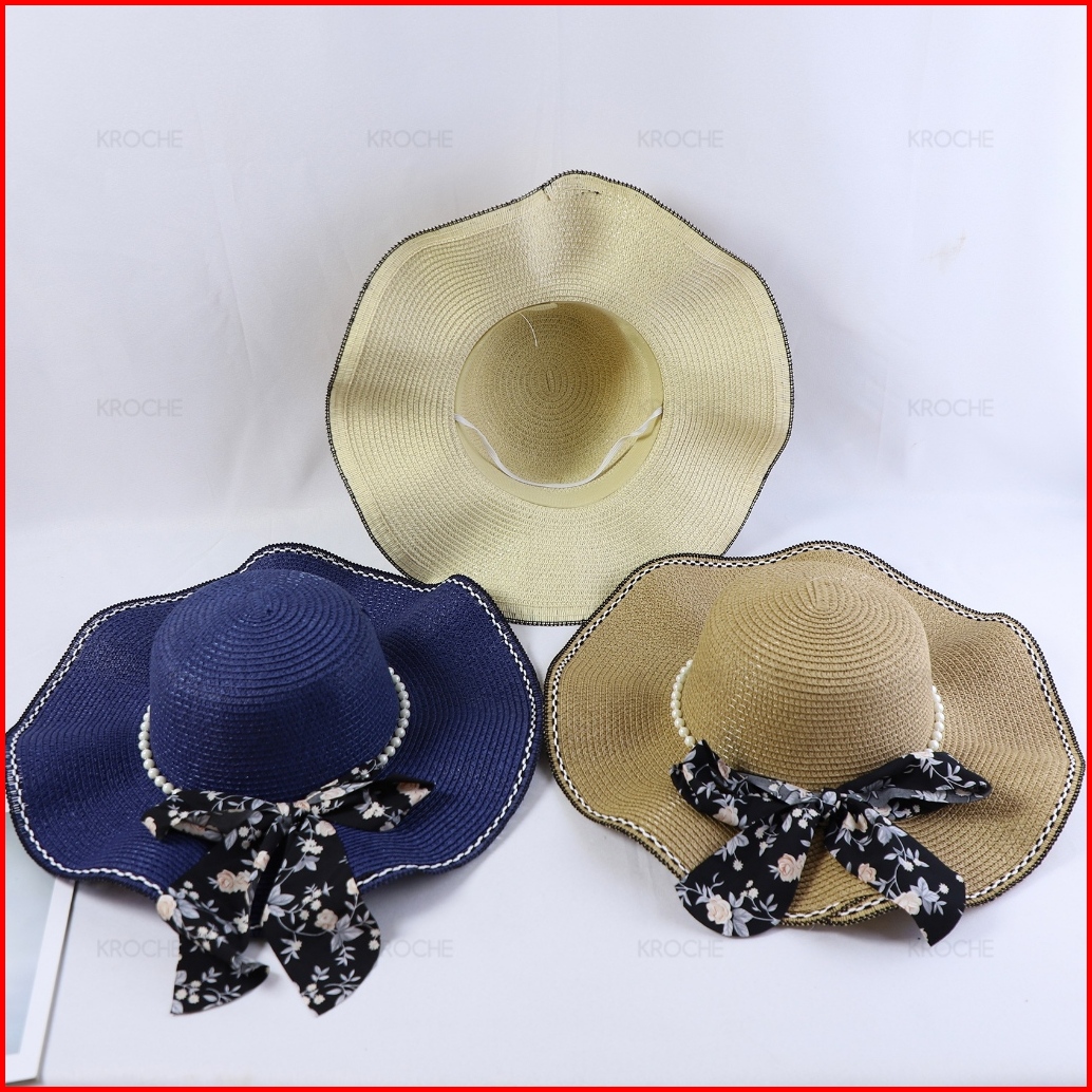 Kroche Topi Pantai Gelombang Pita Pelindung Uv Topi Pantai Bunga Aksen Mutiara