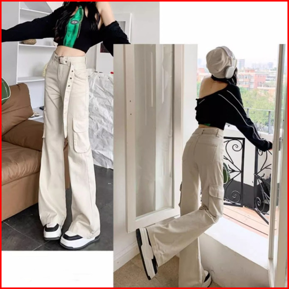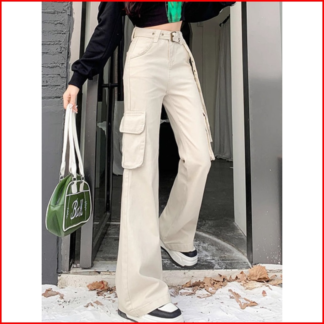 Korean Krem Cargo Highwaist Kasual Celana Panjang Wanita