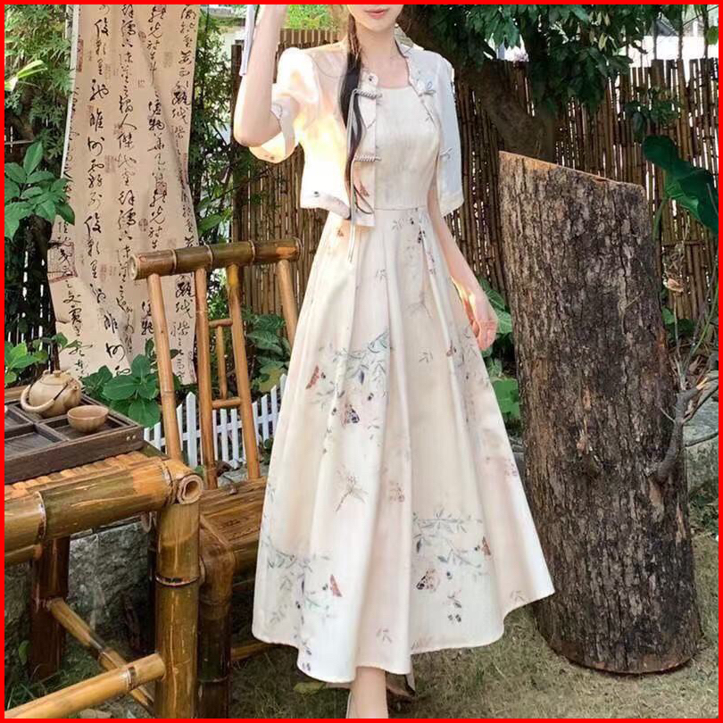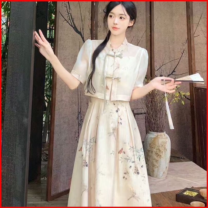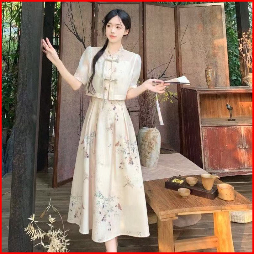First Girl - Setelan Dua Potong Gaun Suspender Jaket Lengan Pendek Model Cheongsam Terbaru Setelan Cheongsam - G062