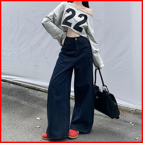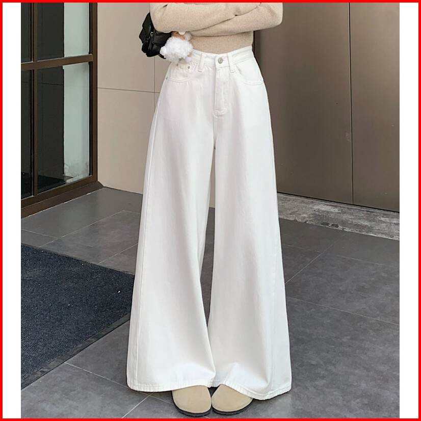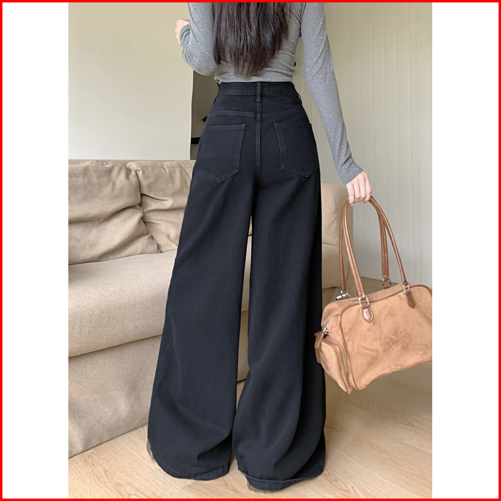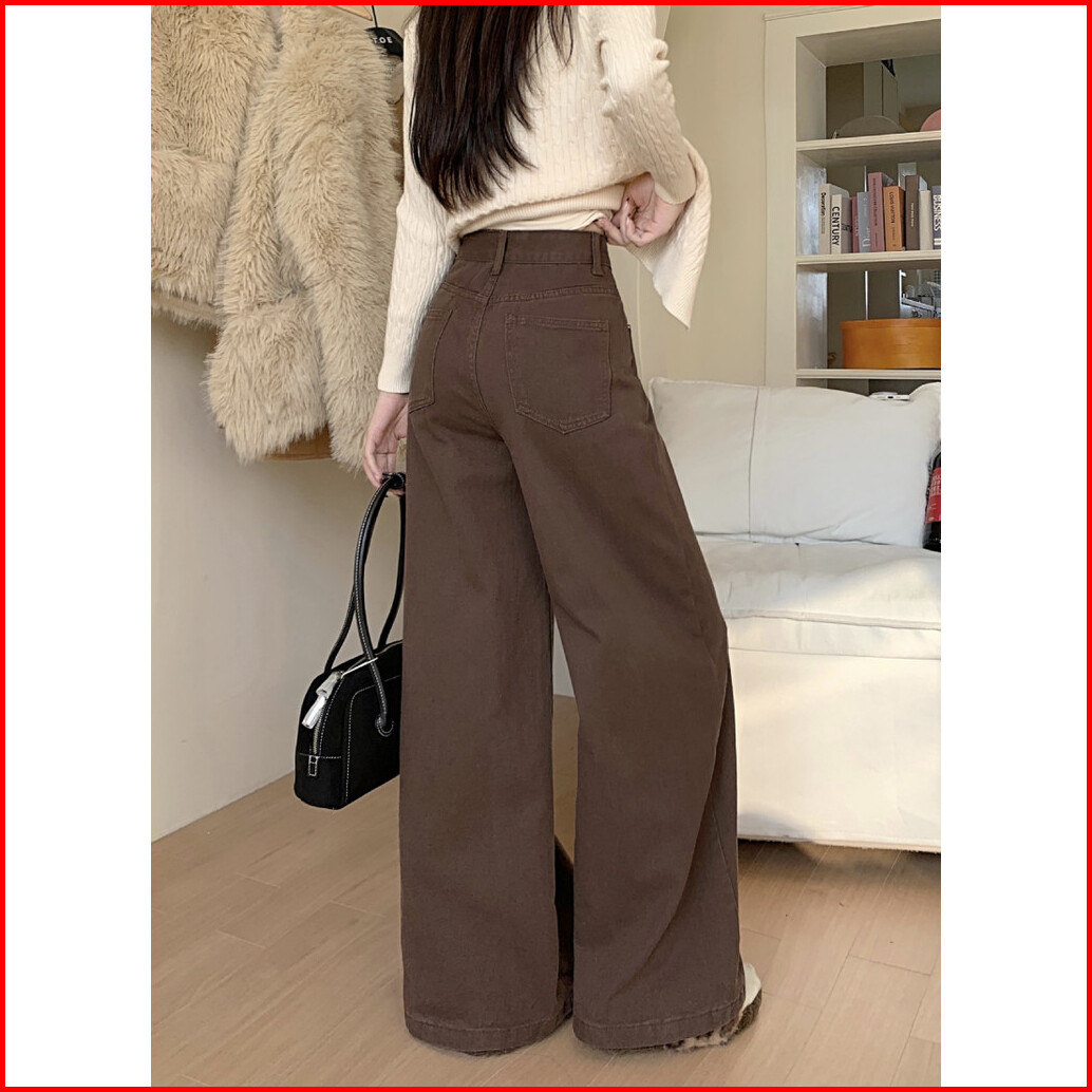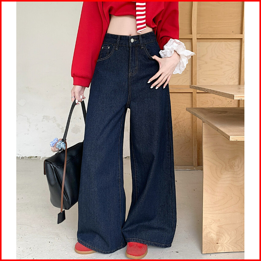 Celana Jeans Pinggang Tinggi Retro Korea Celana Jeans Kaki Lebar Kasual Warna Solid Celana Pel Sederhana