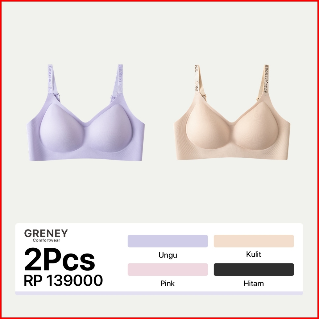 Greney- Paket Bra 2pcs Bra Seamless Mulus Menopang Tali Bahu Huruf Mengkilap Cup Yang Dapat Dilepas Mengumpul Alami 8987