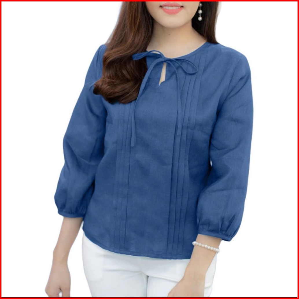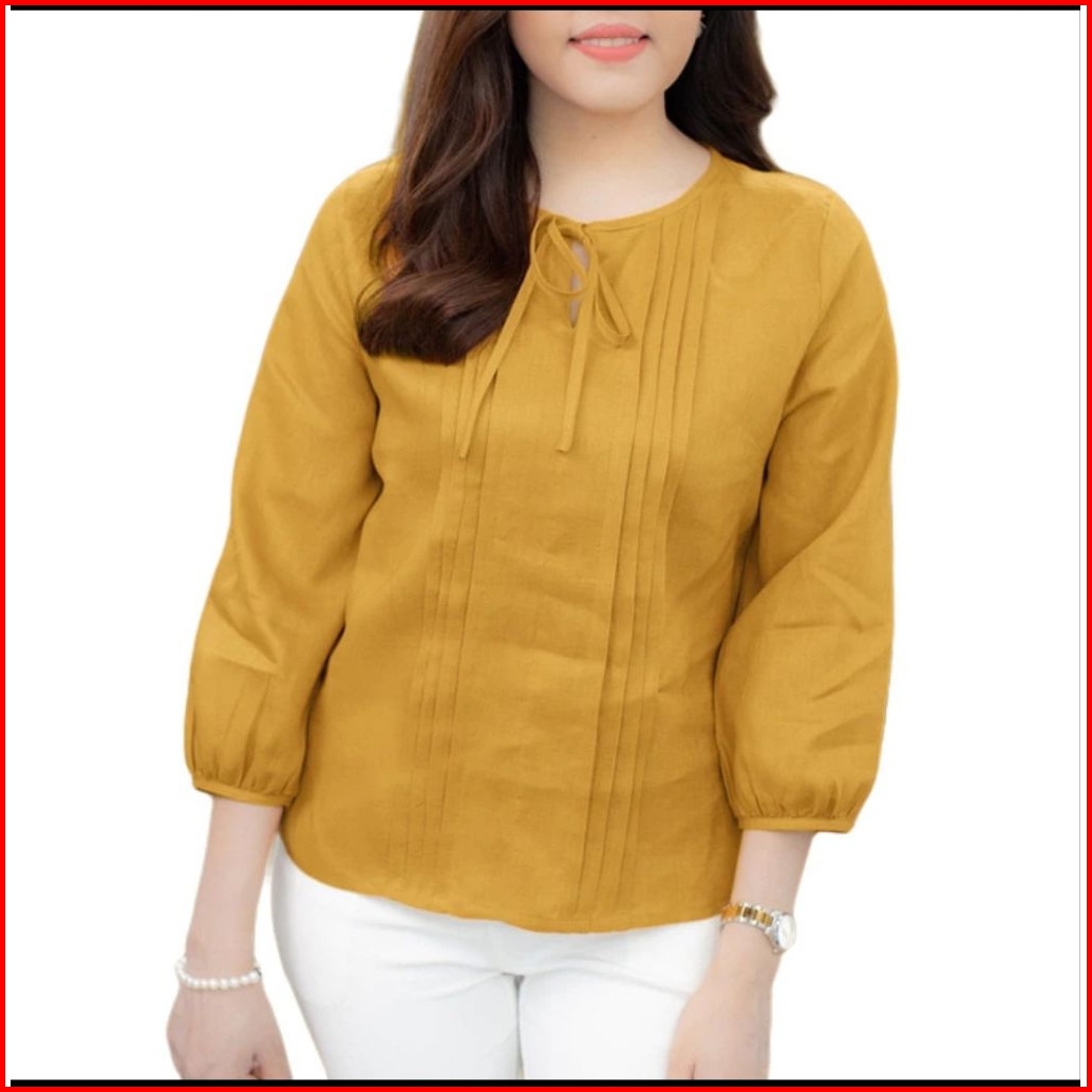 Atasan Blouse Wanita Korea Cantik Imut Kerah Bulat Tali Lipit Warna Solid
