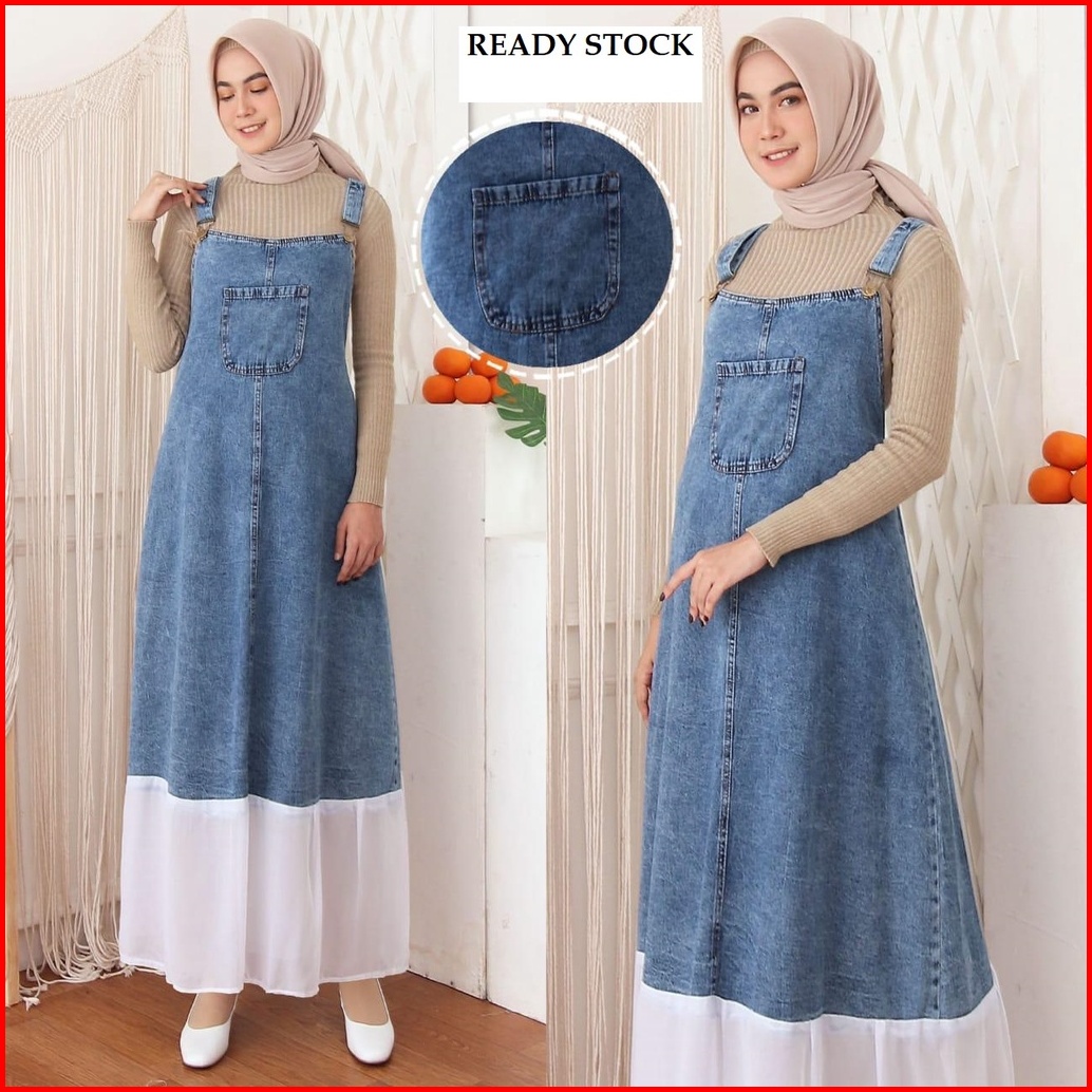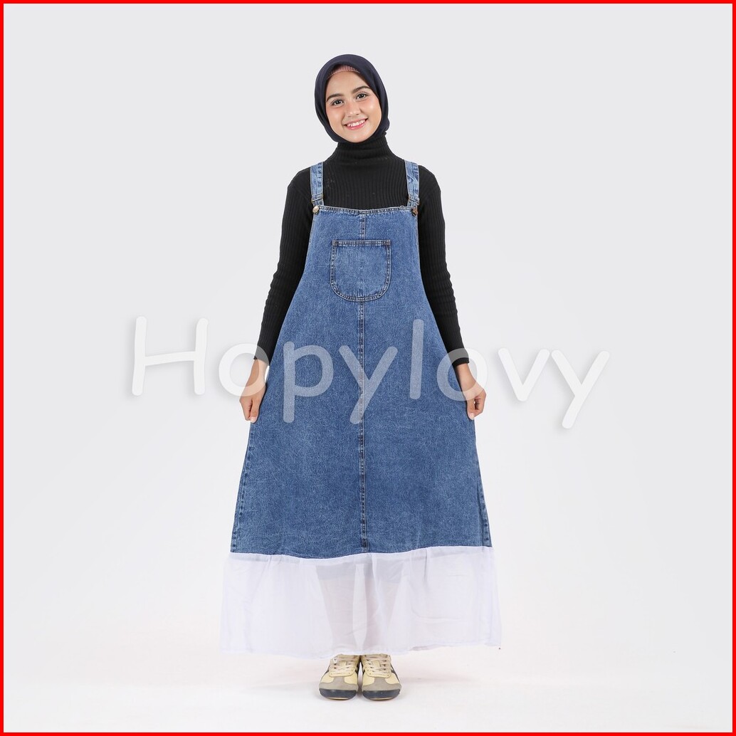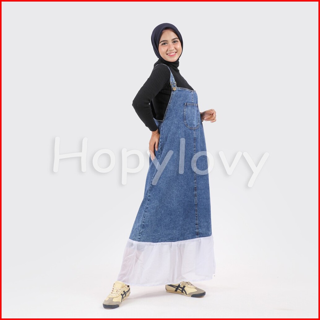 Hopylovy - Overall Rok Panjang Jeans Washed Aura Kombinasi Sifon Putih