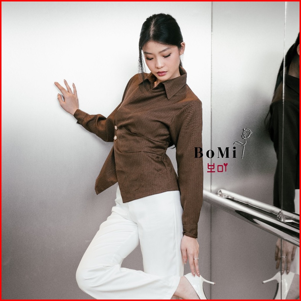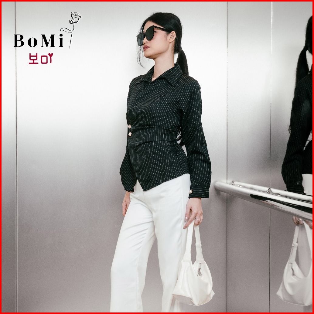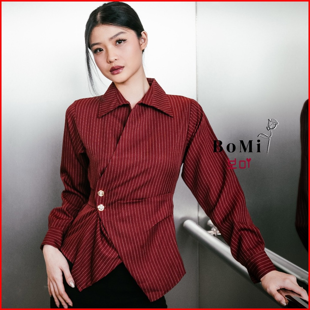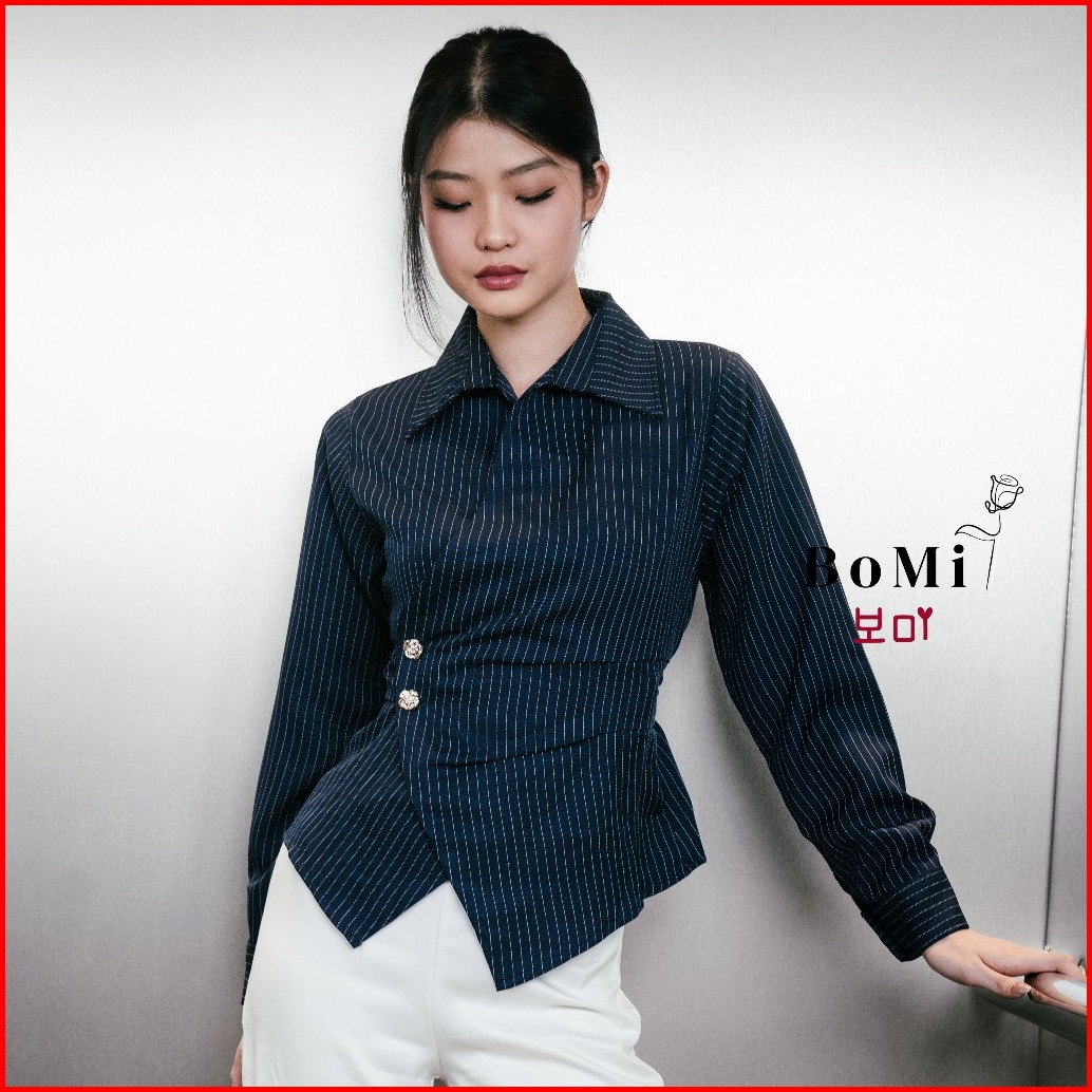 Bomi - Quinn Kemeja Blouse Korean Pocked Fitted Shirt Kemeja Dengan Kantong Salur Garis Nyaman