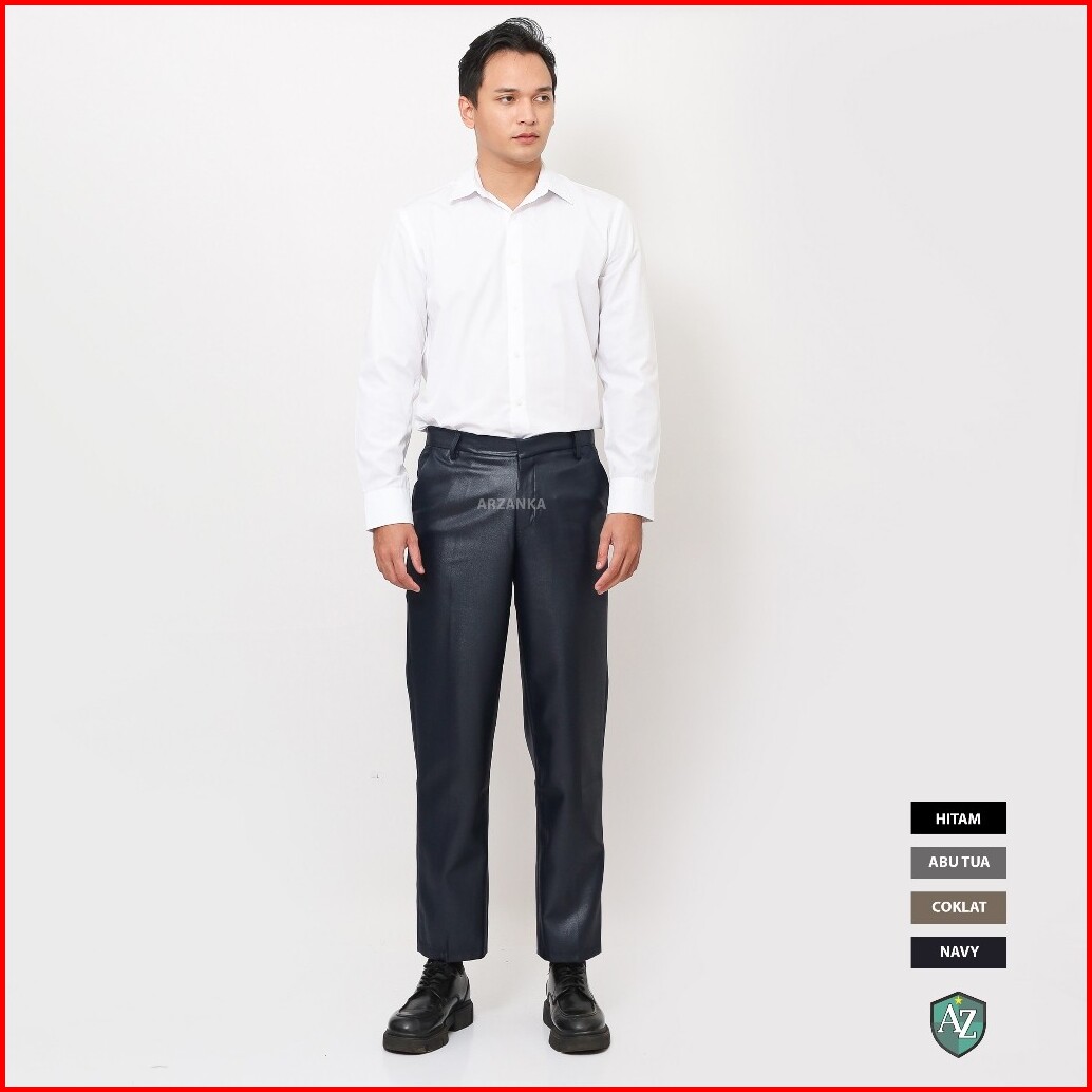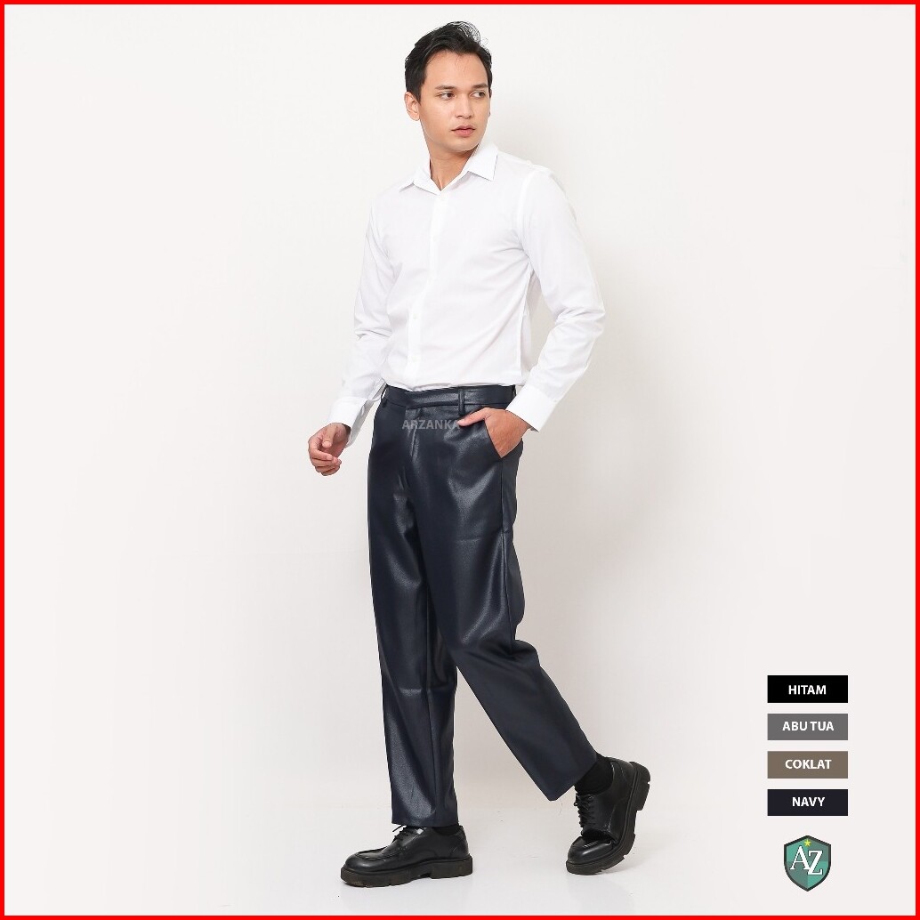 Arzanka - Celana Kerja Formal Mengkilap Warna Biru Navy Bahan Metalik