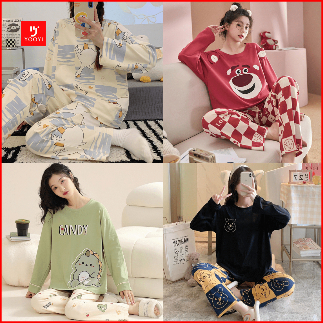 Yooyi Baju Tidur Wanita Set Dewasa Bahan Katun Adem Lengan Panjang Celana Panjang Piyama Setelan Perempuan Remaja Oversi