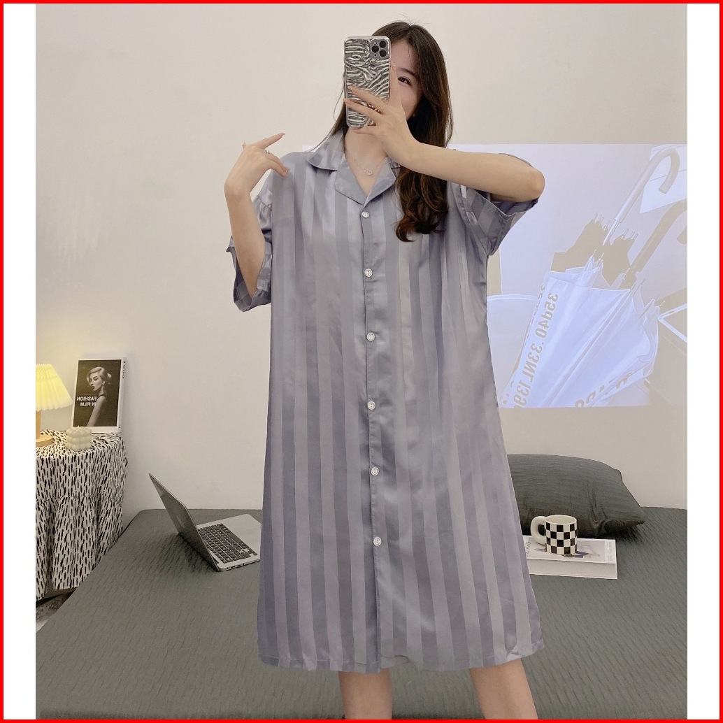 Kyara Dress Sleepwear Daster Tidur Satin Silk Piyama Wanita Lengan Pendek Motif Garis Polos Fashion Korea Kasual