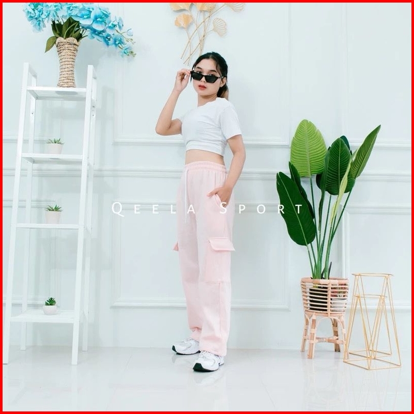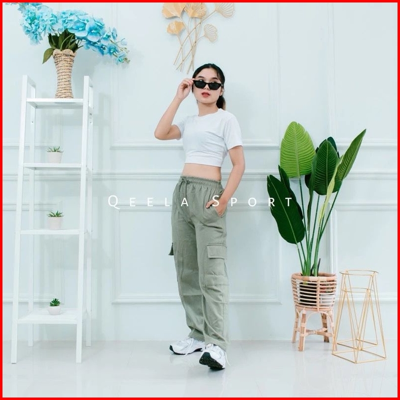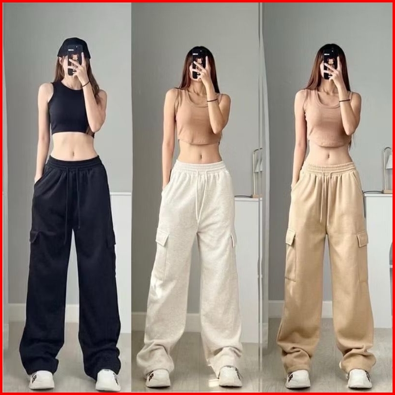 Celana Pocket Cargo Panjang Wanita Highwaist Sweatpants Wanita