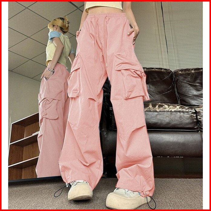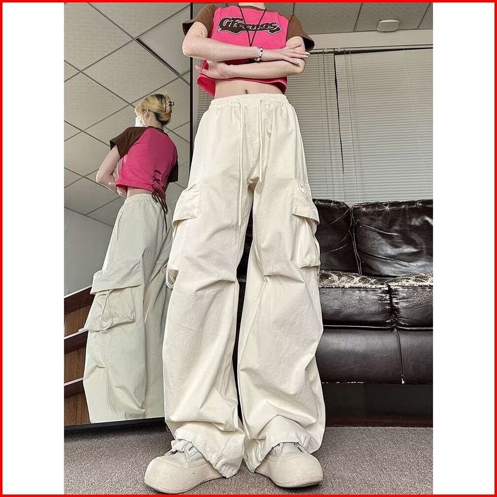 Celana Cargo Wanita Multi-saku Longgar Kasual Terusan Pinggang Tinggi Retro - Wanita Gaya Korea Celana Longgar