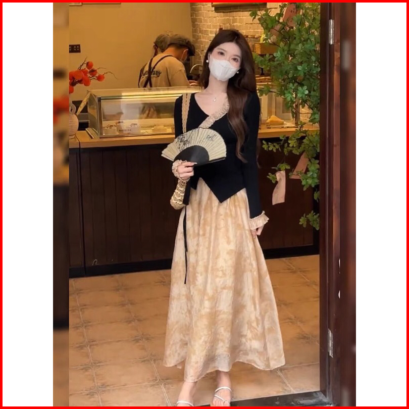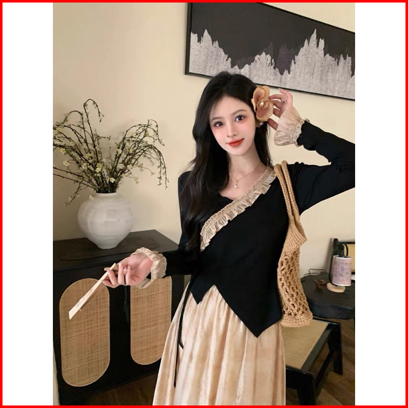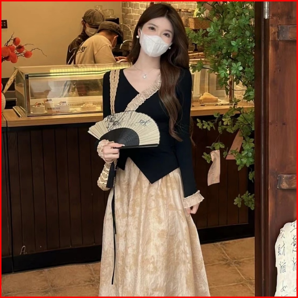 First Girl-one Set New Style V-neck Lace Top High Waist Lengan Panjang Baju Dress Wanita Terbaru 2024- G036