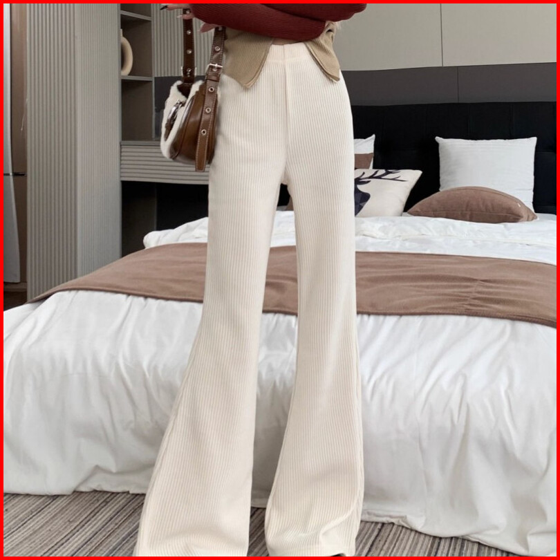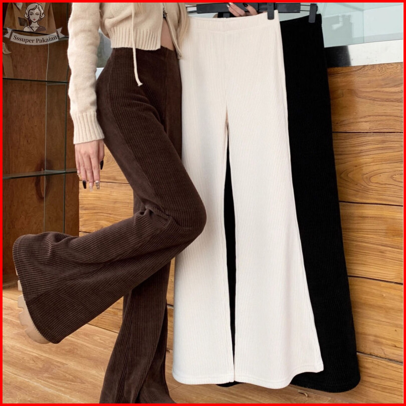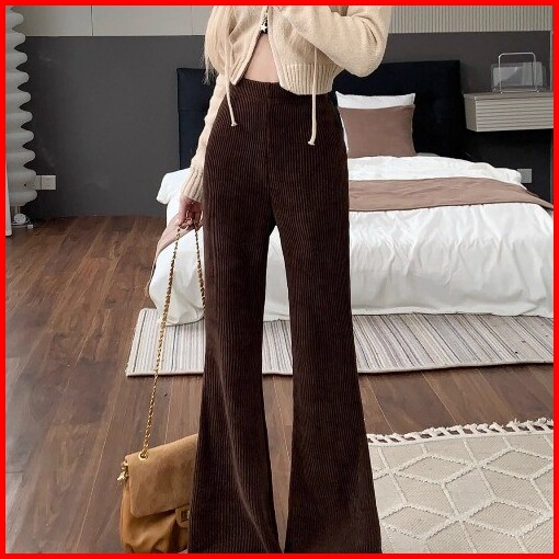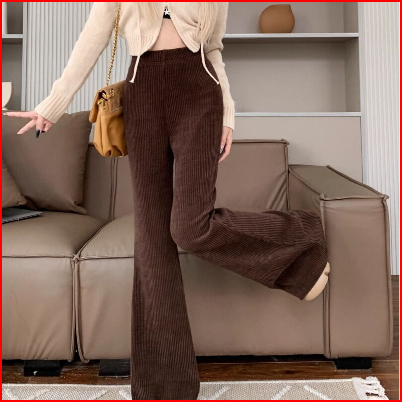 Celana Flare Korduroi Ramping Pinggang Tinggi Wanita Celana Kaki Lebar Kasual Modis