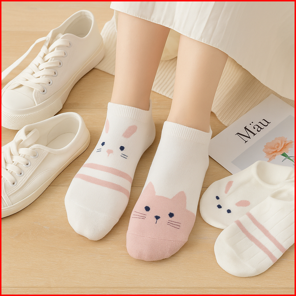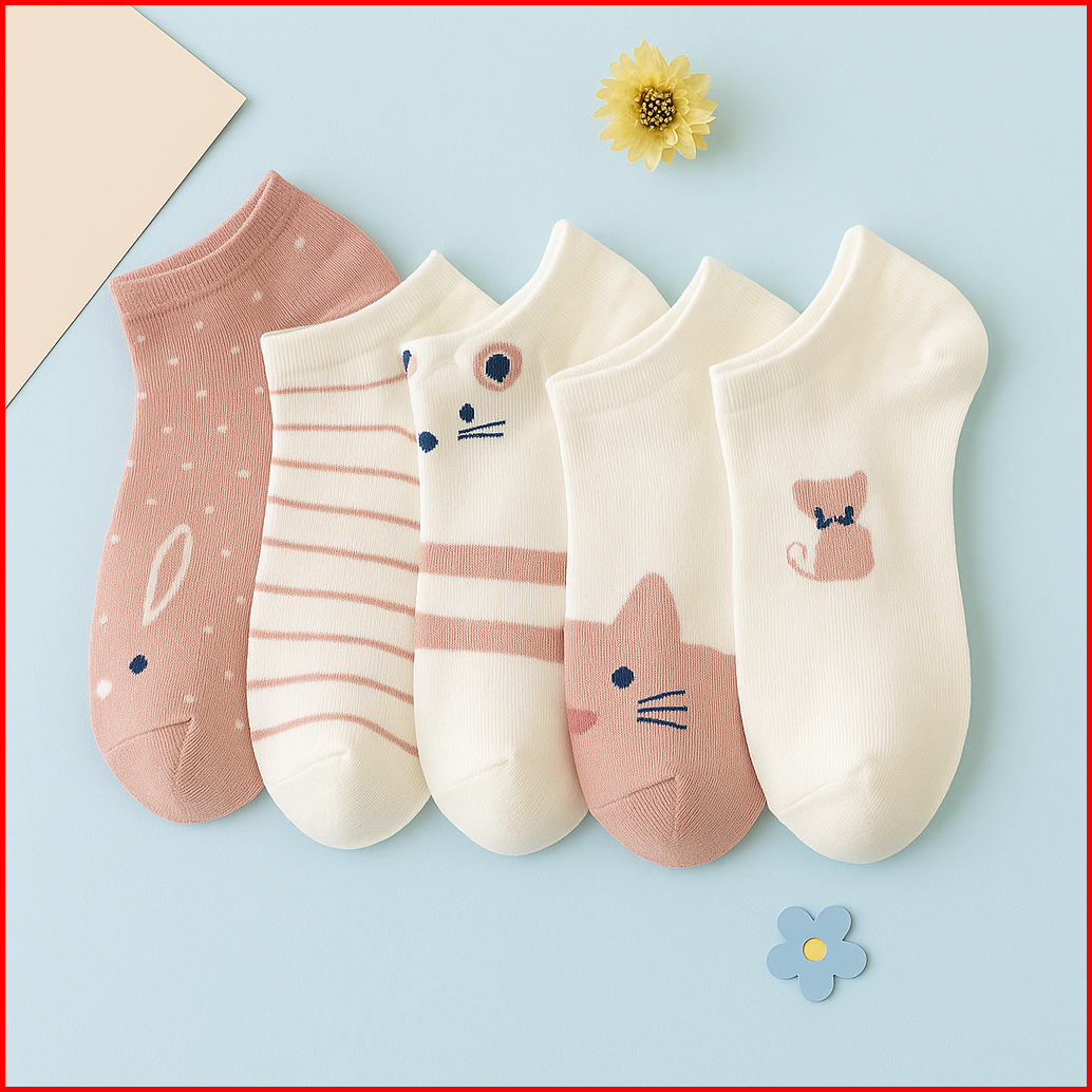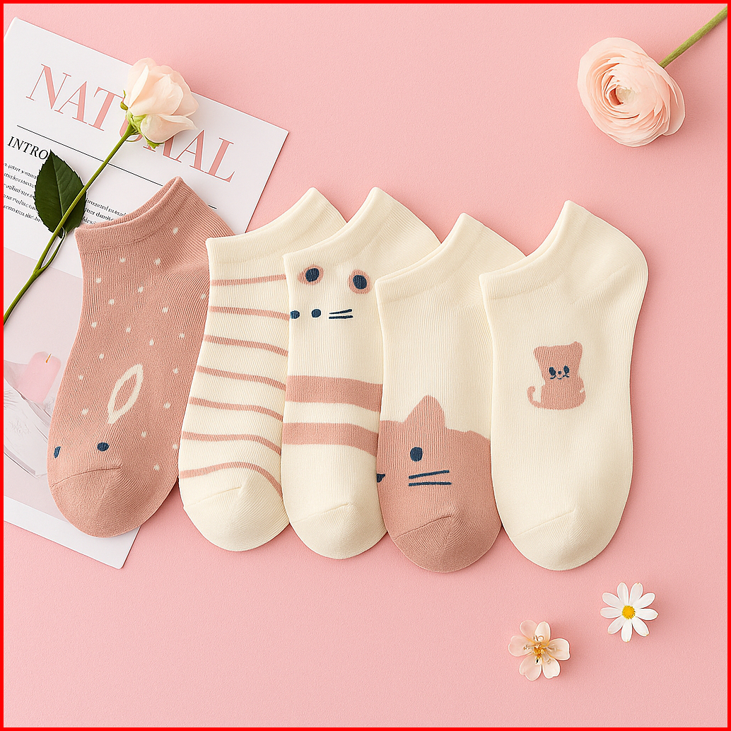 Kaos Kaki Ankle Bundle 5 Pasang Katun Motif Pink Lucu - Khansa